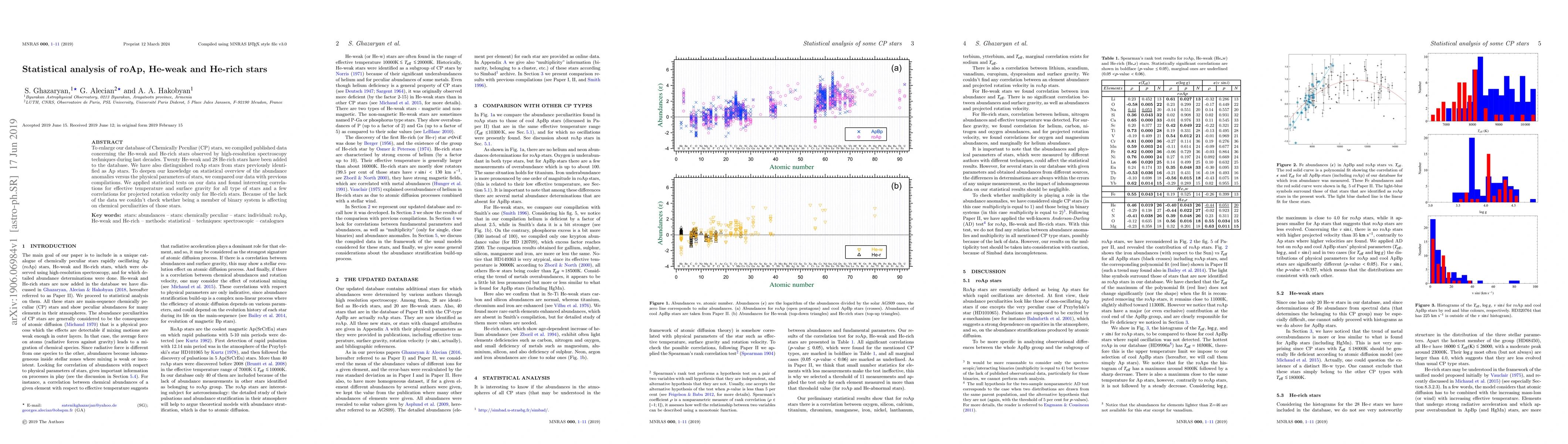 To enlarge our database of Chemically Peculiar (CP) stars, we compiled published data concerning the He-weak and He-rich stars observed by high-resolution spectroscopy techniques during last decades. Twenty He-weak and 28 He-rich stars have been added to the database. We have also distinguished roAp stars from stars previously identified as Ap stars. To deepen our knowledge on statistical overview of the abundance anomalies versus the physical parameters of stars, we compared our data with previous compilations. We applied statistical tests on our data and found interesting correlations for effective temperature and surface gravity for all type of stars and a few correlations for projected rotation velocity only for He-rich stars. Because of the lack of the data we couldn't check whether being a member of binary system is affecting on chemical peculiarities of those stars.