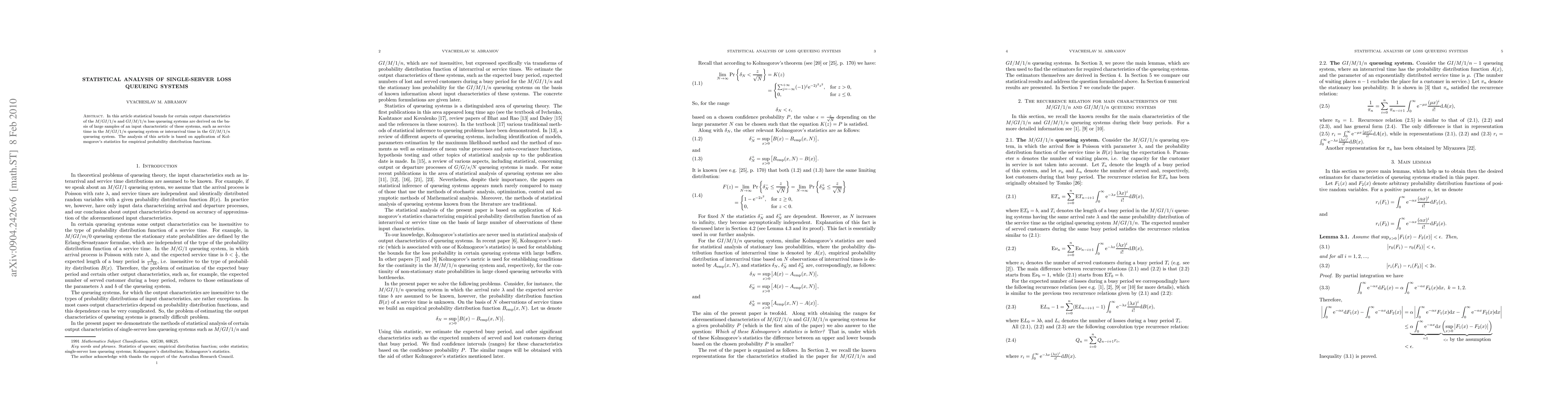 In this article statistical bounds for certain output characteristics of the $M/GI/1/n$ and $GI/M/1/n$ loss queueing systems are derived on the basis of large samples of an input characteristic of these systems, such as service time in the $M/GI/1/n$ queueing system or interarrival time in the $GI/M/1/n$ queueing system. The analysis of this article is based on application of Kolmogorov's statistics for empirical probability distribution functions.