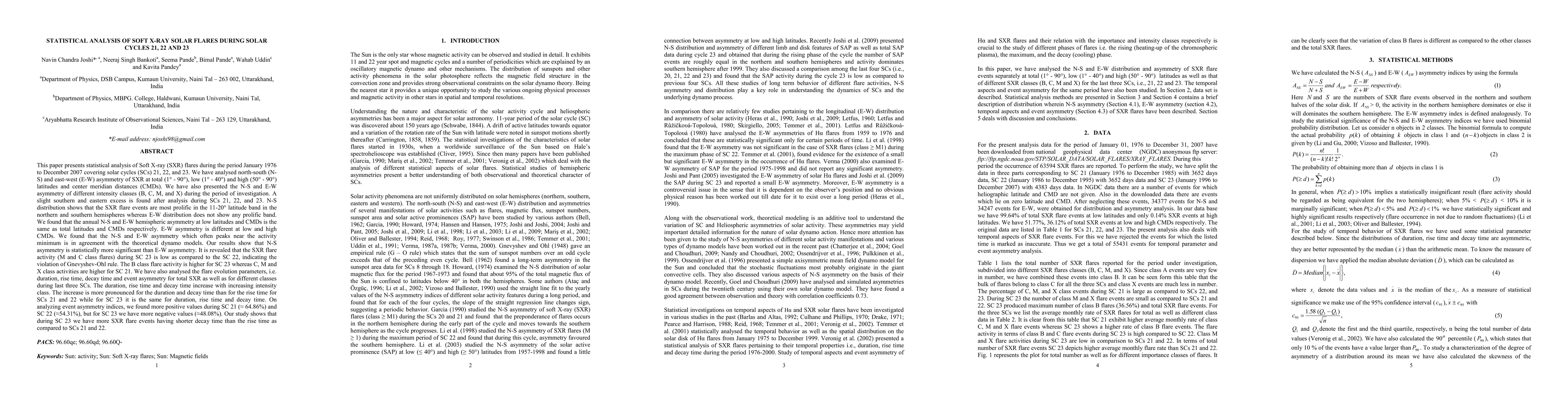 The study uses statistical analysis of Soft X-ray (SXR) flares from solar cycles 21, 22, and 23, examining north-south (N-S) and east-west (E-W) asymmetry at low, high latitudes, and center meridian distances (CMDs). It also analyzes different intensity classes (B, C, M, X) and flare evolution parameters like duration, rise time, decay time, and event asymmetry.