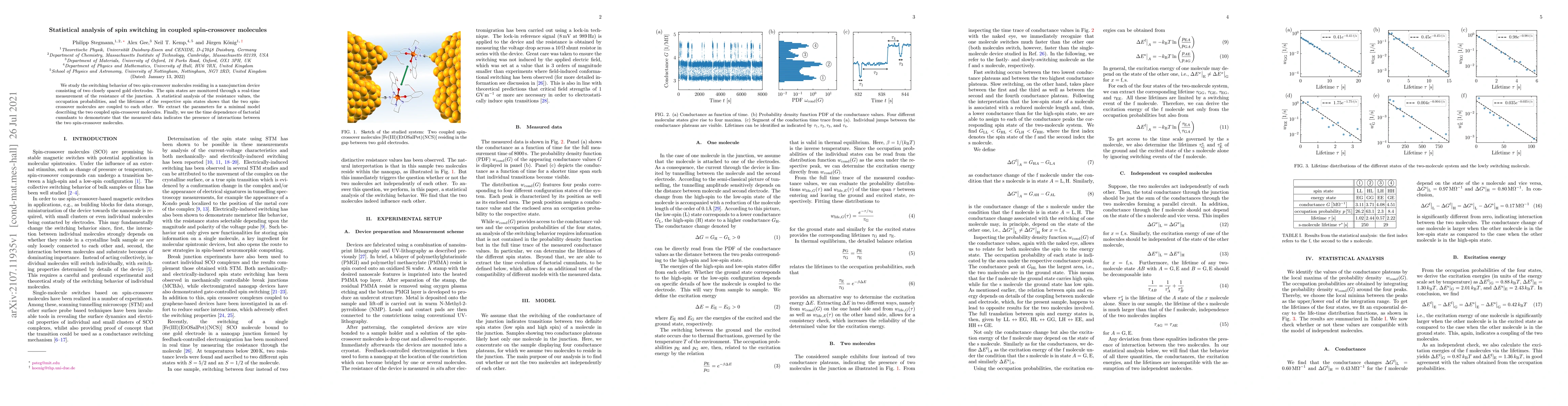 The paper presents a detailed statistical analysis method for characterizing the switching behavior of coupled spin-crossover molecules in a nanojunction, including the extraction of model parameters and the use of factorial cumulants to demonstrate intermolecular interactions.