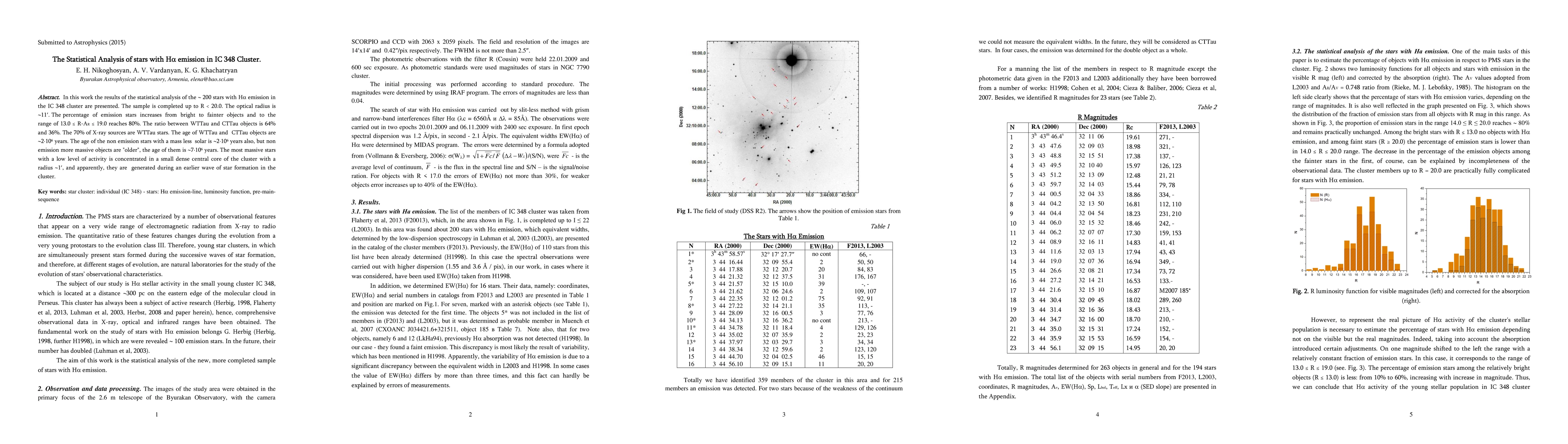This study statistically analyzes 215 stars with Hα emission in the IC 348 cluster, showing that the percentage of emission stars increases with faintness, reaching 80% in the 13.0<R-AR<19.0 range. The cluster comprises 64% WTTau and 36% CTTau objects, with 70% of X-ray sources being WTTau stars, all of which are approximately 2*10^6 years old.