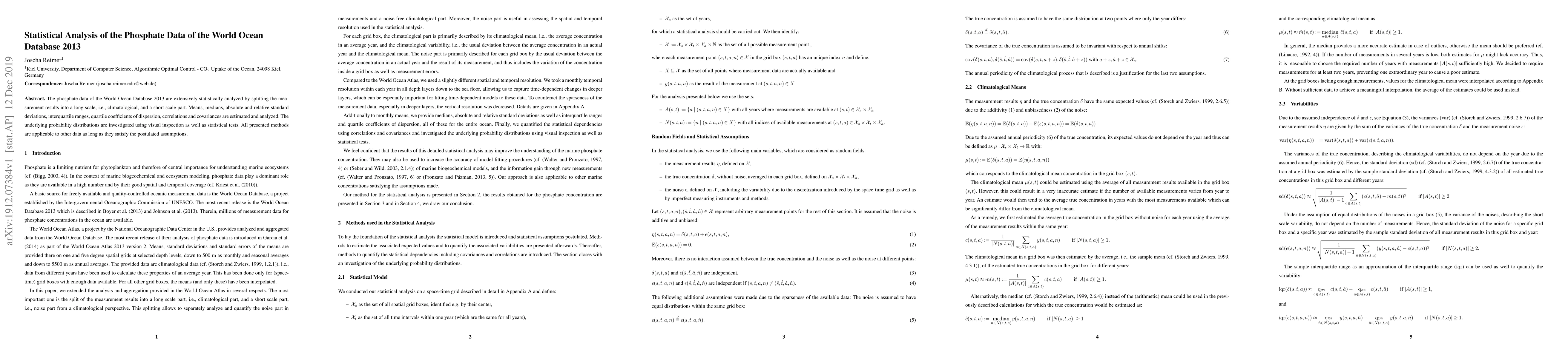 The phosphate data of the World Ocean Database 2013 are extensively statistically analyzed by splitting the measurement results into a long scale, i.e., climatological, and a short scale part. Means, medians, absolute and relative standard deviations, interquartile ranges, quartile coefficients of dispersion, correlations and covariances are estimated and analyzed. The underlying probability distributions are investigated using visual inspection as well as statistical tests. All presented methods are applicable to other data as long as they satisfy the postulated assumptions.
