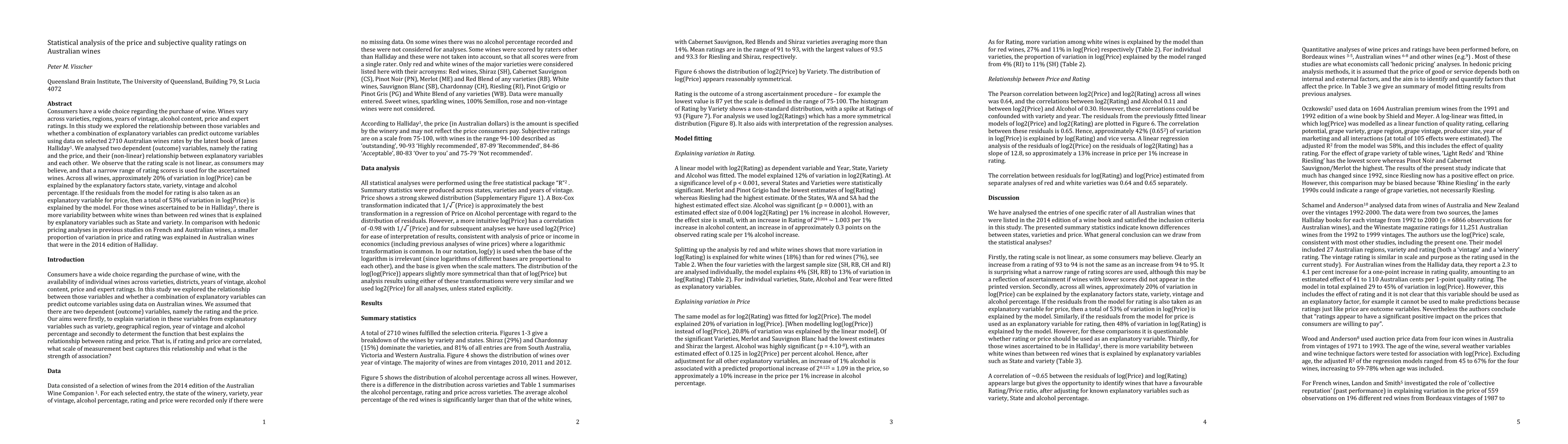This study analyzed 2710 Australian wines to understand the relationship between price, subjective quality ratings, and various wine characteristics. It found that a combination of explanatory variables can predict price with moderate accuracy, but the rating scale is not linear.