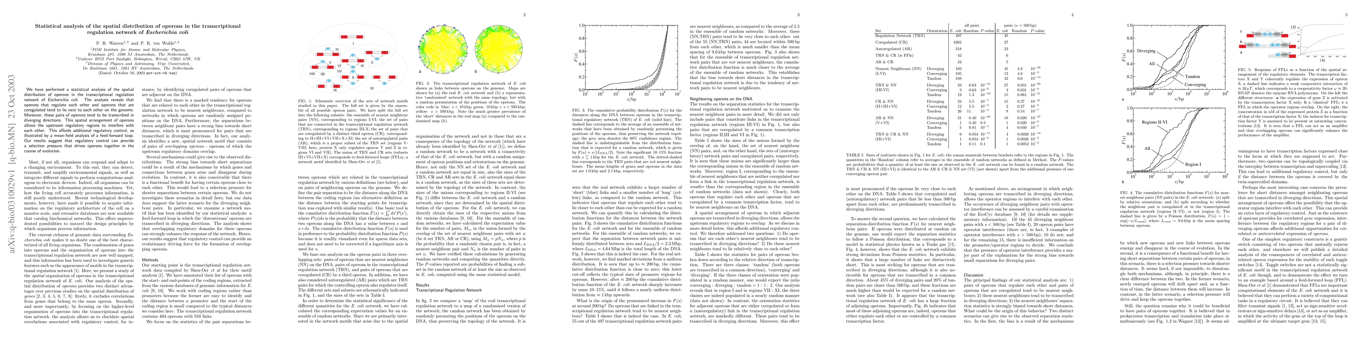 We have performed a statistical analysis of the spatial distribution of operons in the transcriptional regulation network of Escherichia coli. The analysis reveals that operons that regulate each other and operons that are coregulated tend to lie next to each other on the genome. Moreover, these pairs of operons tend to be transcribed in diverging directions. This spatial arrangement of operons allows the upstream regulatory regions to interfere with each other. This affords additional regulatory control, as illustrated by a mean-field analysis of a feed-forward loop. Our results suggest that regulatory control can provide a selection pressure that drives operons together in the course of evolution.
