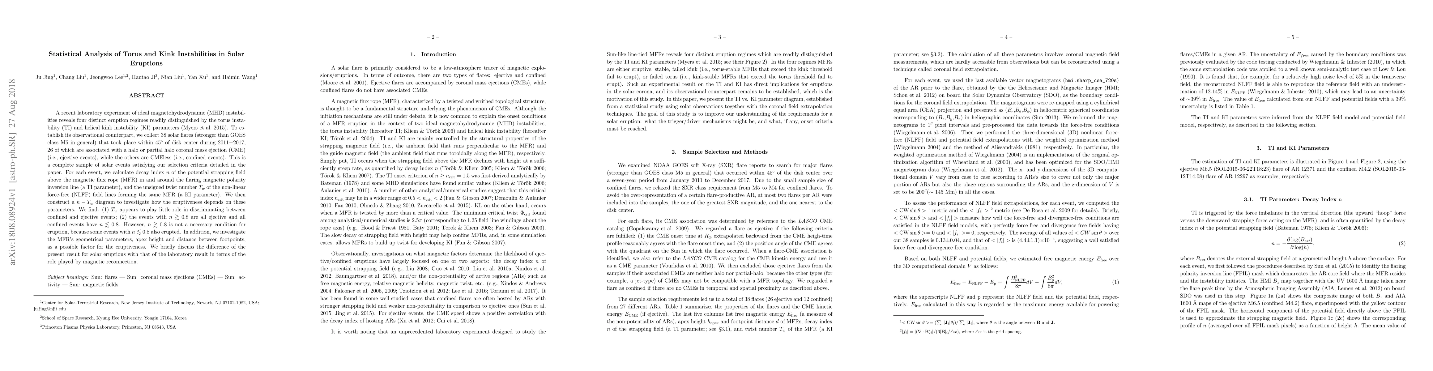 This study investigates solar flares and coronal mass ejections (CMEs) to identify eruption regimes based on torus instability (TI) and helical kink instability (KI) parameters. The analysis of 38 solar flares shows that while twist number $T_w$ does not significantly differentiate between confined and ejective events, a decay index $n$ of approximately 0.8 effectively distinguishes them, with higher values indicating ejective events.