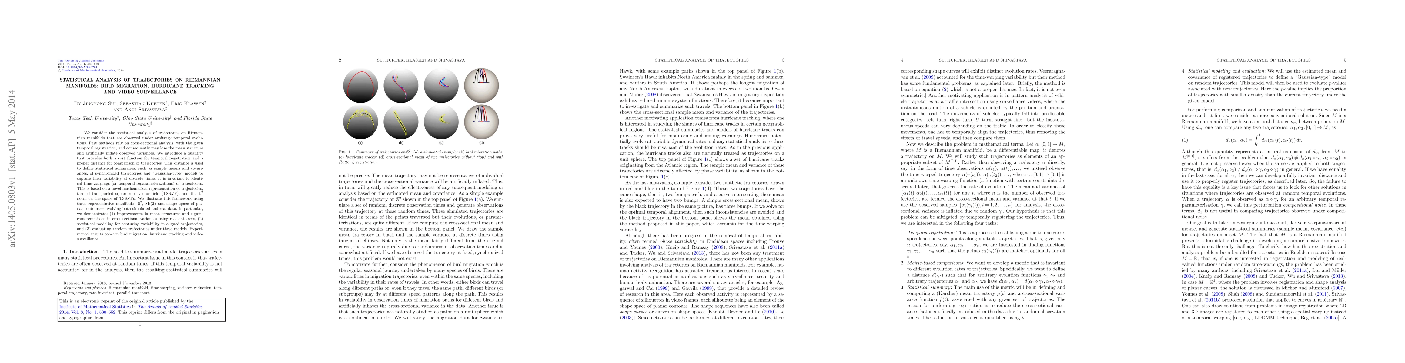 This paper introduces a novel statistical analysis framework for trajectories on Riemannian manifolds, providing a new distance measure for trajectory comparison and temporal registration. The method improves mean structures and reduces variances, demonstrated through applications in bird migration, hurricane tracking, and video surveillance.