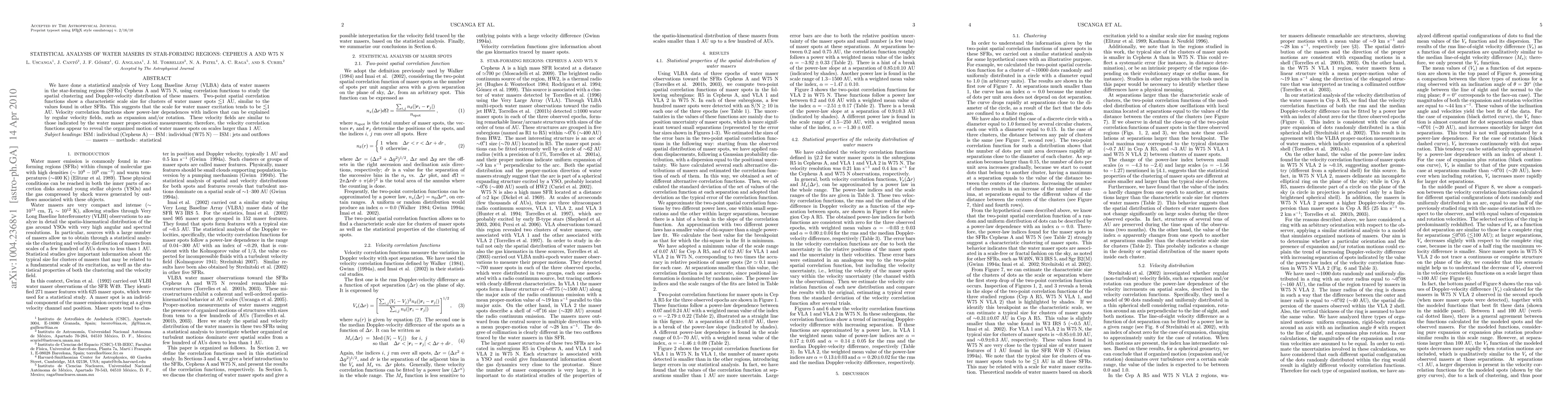 We have done a statistical analysis of Very Long Baseline Array (VLBA) data of water masers in the star-forming regions (SFRs) Cepheus A and W75 N, using correlation functions to study the spatial clustering and Doppler-velocity distribution of these masers. Two-point spatial correlation functions show a characteristic scale size for clusters of water maser spots < or ~1 AU, similar to the values found in other SFRs. This suggests that the scale for water maser excitation tends to be < or ~1 AU. Velocity correlation functions show power-law dependences with indices that can be explained by regular velocity fields, such as expansion and/or rotation. These velocity fields are similar to those indicated by the water maser proper-motion measurements; therefore, the velocity correlation functions appear to reveal the organized motion of water maser spots on scales larger than 1 AU.