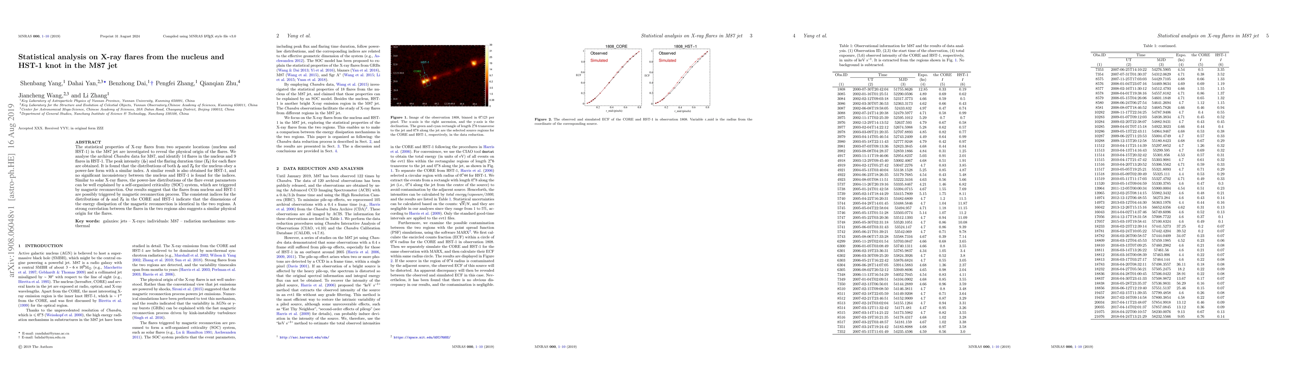 The statistical properties of X-ray flares from two separate locations (nucleus and HST-1) in the M87 jet are investigated to reveal the physical origin of the flares. We analyse the archival \textit{Chandra} data for M87, and identify 14 flares in the nucleus and 9 flares in HST-1. The peak intensity ($I_{\rm{P}}$) and the flaring duration time ($T_{\rm{fl}}$) for each flare are obtained. It is found that the distributions of both $I_{\rm{P}}$ and $T_{\rm{fl}}$ for the nucleus obey a power-law form with a similar index. A similar result is also obtained for HST-1, and no significant inconsistency between the nucleus and HST-1 is found for the indices. Similar to solar X-ray flares, the power-law distributions of the flare event parameters can be well explained by a self-organized criticality (SOC) system, which are triggered by magnetic reconnection. Our results suggest that the flares from nucleus and HST-1 are possibly triggered by magnetic reconnection process. The consistent indices for the distributions of $I_{\rm{P}}$ and $T_{\rm{fl}}$ in the CORE and HST-1 indicate that the dimensions of the energy dissipation of the magnetic reconnection is identical in the two regions. A strong correlation between the flares in the two regions also suggests a similar physical origin for the flares.