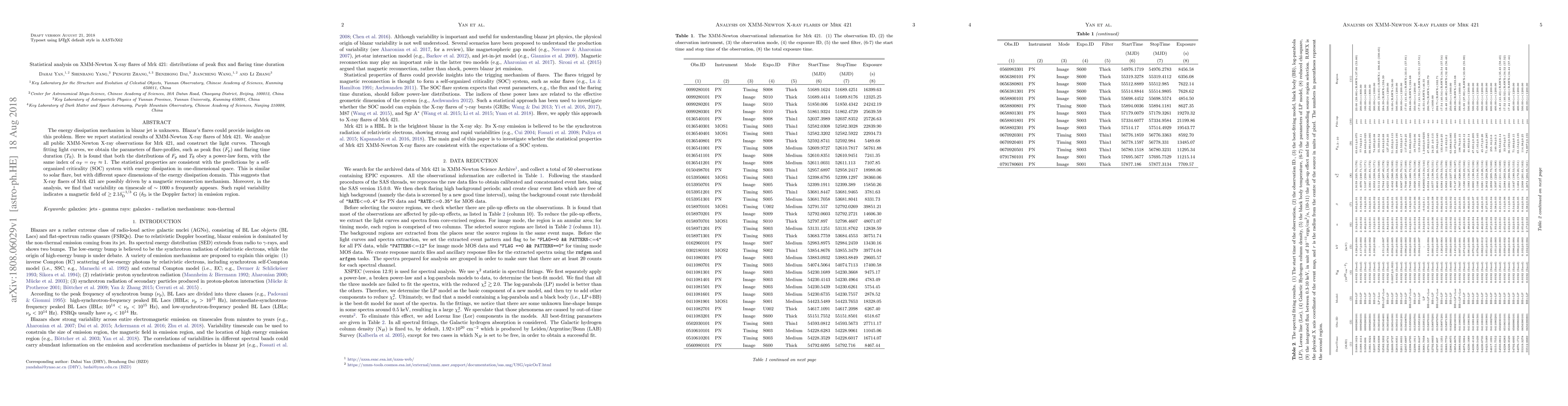 The study analyzes XMM-Newton X-ray flares of blazar Mrk 421, finding that peak flux ($F_{ m p}$) and flaring time duration ($T_{ m fl}$) distributions follow power-law forms with index approximately 1. This suggests a self-organized criticality system driven by magnetic reconnection, similar to solar flares but in a different dimension. Rapid variability indicates a magnetic field of at least 2.1 G in the emission region.