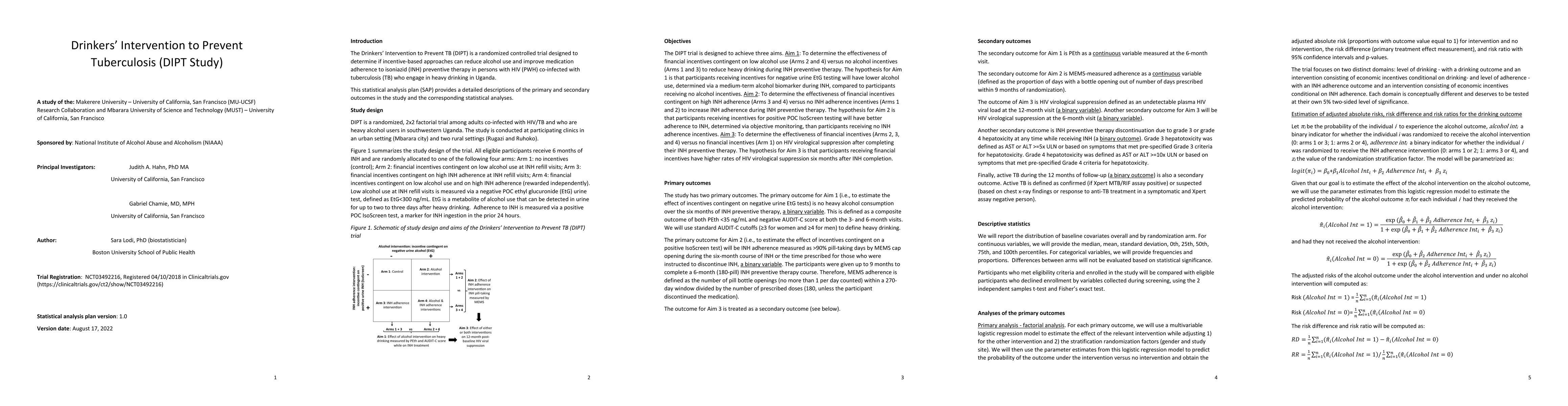 The DIPT Study is a randomized controlled trial assessing incentive-based interventions to reduce alcohol use and enhance medication adherence to TB preventive therapy in HIV-TB co-infected heavy drinkers in Uganda. The statistical analysis plan outlines the primary and secondary outcomes and the methods for their evaluation.
