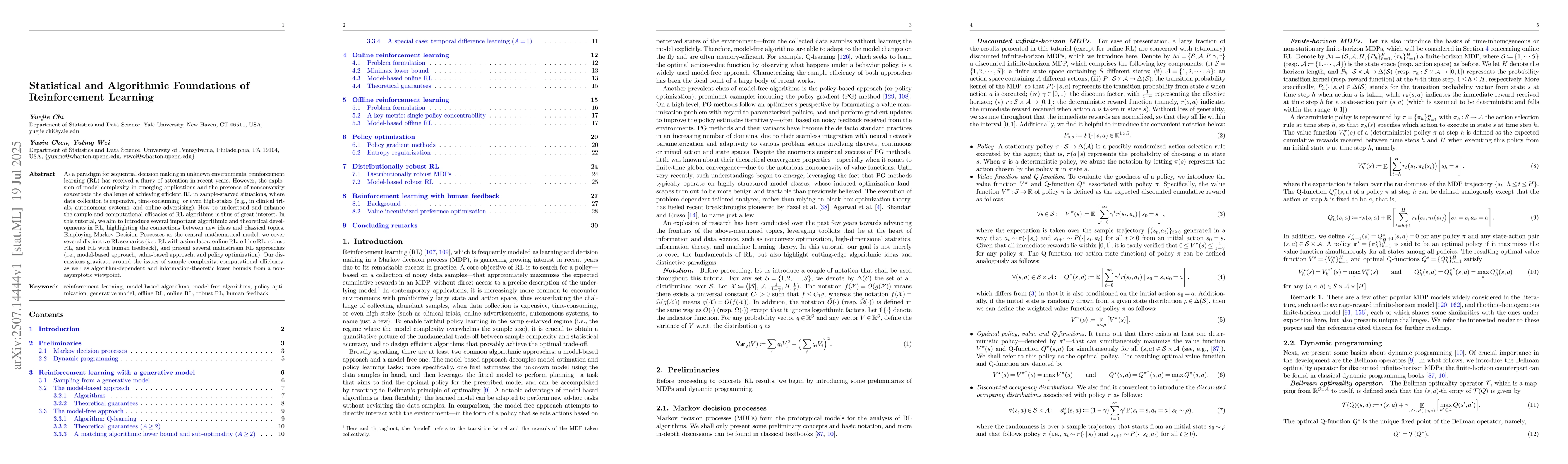As a paradigm for sequential decision making in unknown environments, reinforcement learning (RL) has received a flurry of attention in recent years. However, the explosion of model complexity in emerging applications and the presence of nonconvexity exacerbate the challenge of achieving efficient RL in sample-starved situations, where data collection is expensive, time-consuming, or even high-stakes (e.g., in clinical trials, autonomous systems, and online advertising). How to understand and enhance the sample and computational efficacies of RL algorithms is thus of great interest. In this tutorial, we aim to introduce several important algorithmic and theoretical developments in RL, highlighting the connections between new ideas and classical topics. Employing Markov Decision Processes as the central mathematical model, we cover several distinctive RL scenarios (i.e., RL with a simulator, online RL, offline RL, robust RL, and RL with human feedback), and present several mainstream RL approaches (i.e., model-based approach, value-based approach, and policy optimization). Our discussions gravitate around the issues of sample complexity, computational efficiency, as well as algorithm-dependent and information-theoretic lower bounds from a non-asymptotic viewpoint.