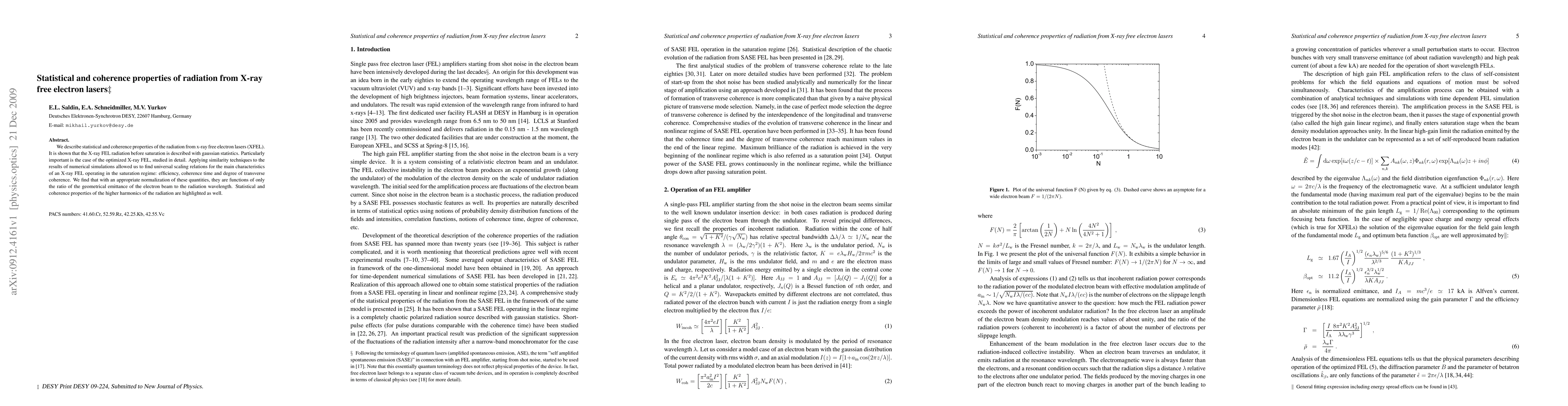This paper investigates the statistical and coherence properties of radiation from x-ray free electron lasers (XFEL), demonstrating that pre-saturation X-ray FEL radiation follows Gaussian statistics. It identifies universal scaling relations for efficiency, coherence time, and transverse coherence, dependent on the ratio of the electron beam's geometrical emittance to the radiation wavelength.