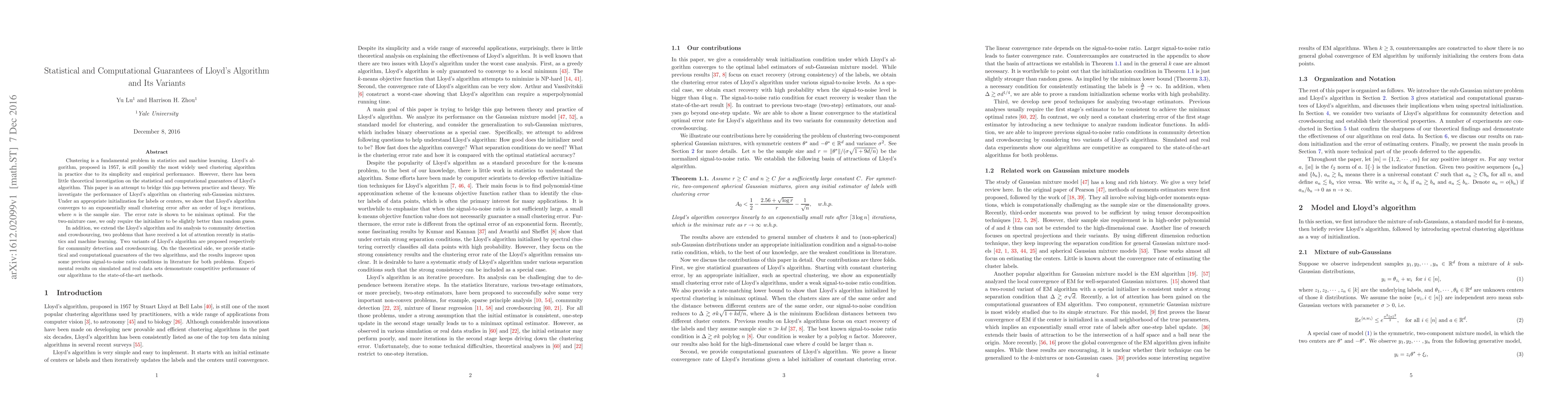 This paper investigates the theoretical guarantees of Lloyd's algorithm and its variants for clustering, community detection, and crowdsourcing. It demonstrates that under proper initialization, Lloyd's algorithm achieves exponentially small clustering error and minimax optimal performance for sub-Gaussian mixtures.