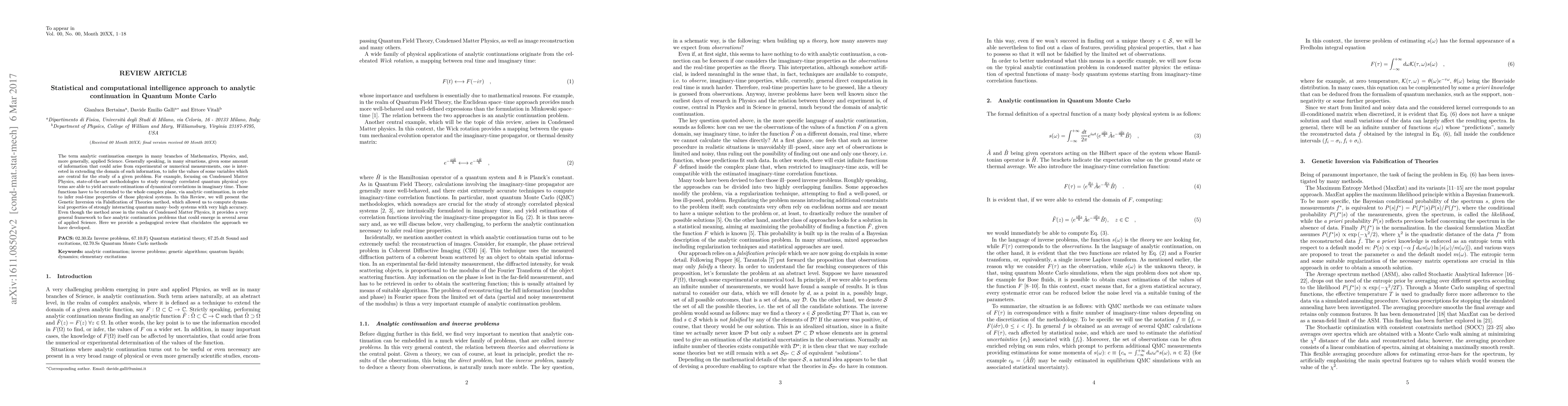 This paper presents a novel statistical and computational intelligence method, Genetic Inversion via Falsification of Theories, for performing analytic continuation in Quantum Monte Carlo, enabling high-accuracy computation of dynamical properties in strongly correlated quantum systems. The method offers a general framework applicable to various analytic continuation problems across applied science.