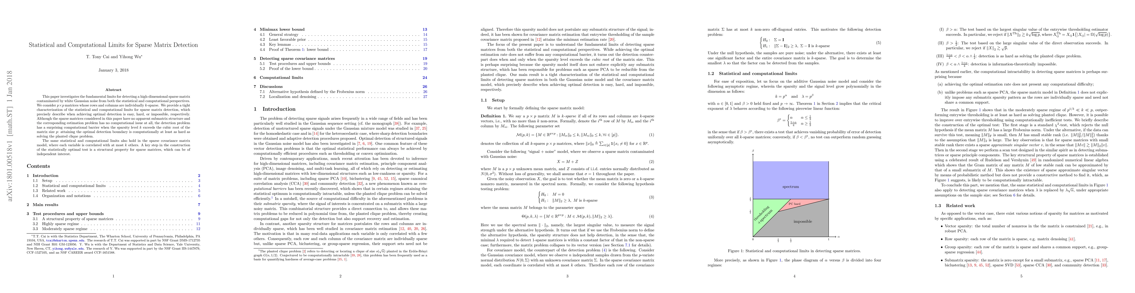 This paper explores the statistical and computational limits for detecting high-dimensional sparse matrices corrupted by Gaussian noise, revealing a computational barrier when the sparsity level exceeds the cubic root of the matrix size. The findings apply to both sparse matrices and the sparse covariance matrix model.