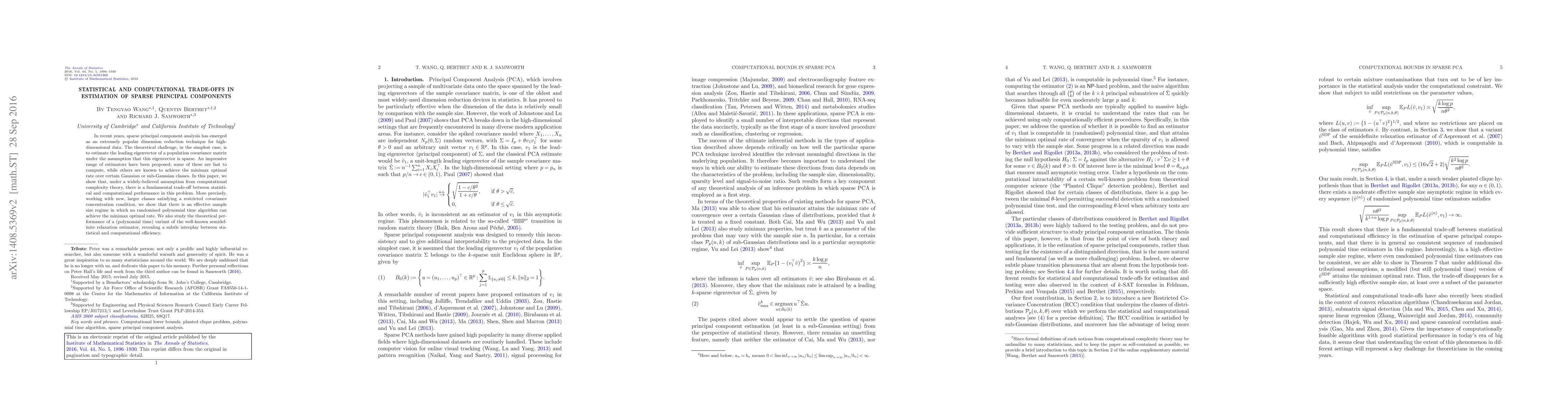This paper explores the trade-offs between statistical accuracy and computational efficiency in estimating sparse principal components. It demonstrates a fundamental limit on achieving optimal statistical performance via randomized polynomial time algorithms under certain conditions, highlighting the intricate balance between these two aspects in high-dimensional data analysis.