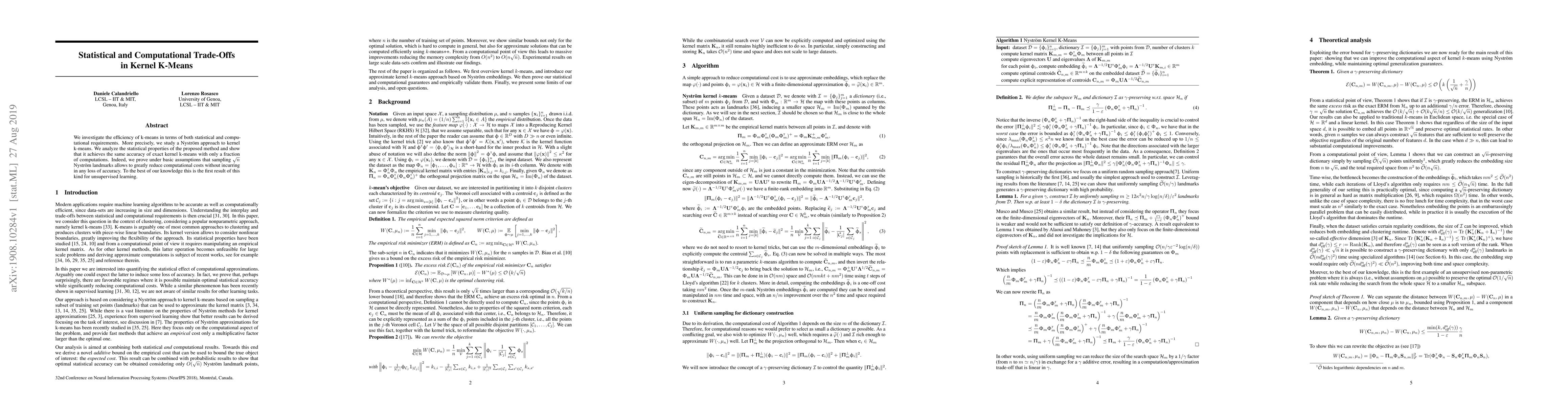 We investigate the efficiency of k-means in terms of both statistical and computational requirements. More precisely, we study a Nystr\"om approach to kernel k-means. We analyze the statistical properties of the proposed method and show that it achieves the same accuracy of exact kernel k-means with only a fraction of computations. Indeed, we prove under basic assumptions that sampling $\sqrt{n}$ Nystr\"om landmarks allows to greatly reduce computational costs without incurring in any loss of accuracy. To the best of our knowledge this is the first result of this kind for unsupervised learning.