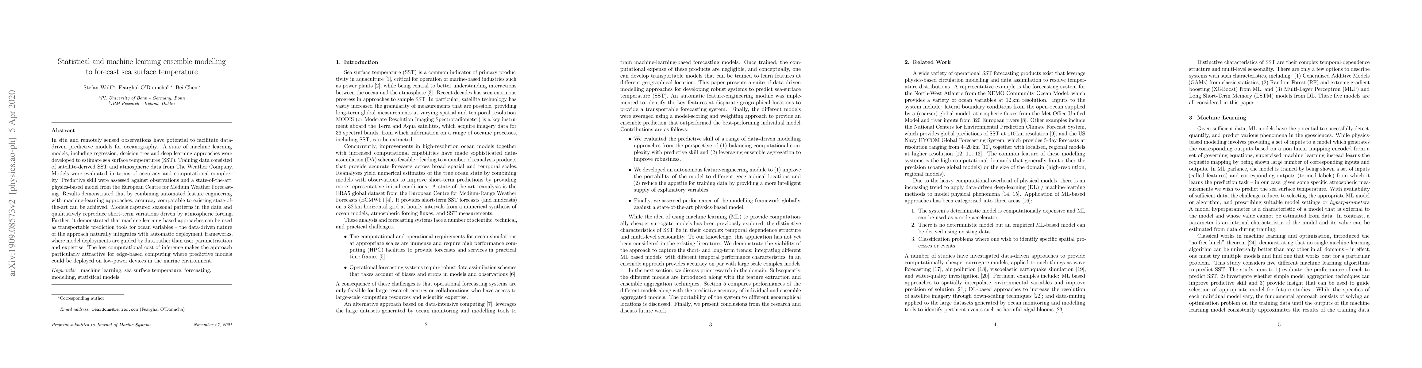 In situ and remotely sensed observations have potential to facilitate data-driven predictive models for oceanography. A suite of machine learning models, including regression, decision tree and deep learning approaches were developed to estimate sea surface temperatures (SST). Training data consisted of satellite-derived SST and atmospheric data from The Weather Company. Models were evaluated in terms of accuracy and computational complexity. Predictive skill were assessed against observations and a state-of-the-art, physics-based model from the European Centre for Medium Weather Forecasting. Results demonstrated that by combining automated feature engineering with machine-learning approaches, accuracy comparable to existing state-of-the-art can be achieved. Models captured seasonal patterns in the data and qualitatively reproduce short-term variations driven by atmospheric forcing. Further, it demonstrated that machine-learning-based approaches can be used as transportable prediction tools for ocean variables -- the data-driven nature of the approach naturally integrates with automatic deployment frameworks, where model deployments are guided by data rather than user-parametrisation and expertise. The low computational cost of inference makes the approach particularly attractive for edge-based computing where predictive models could be deployed on low-power devices in the marine environment.