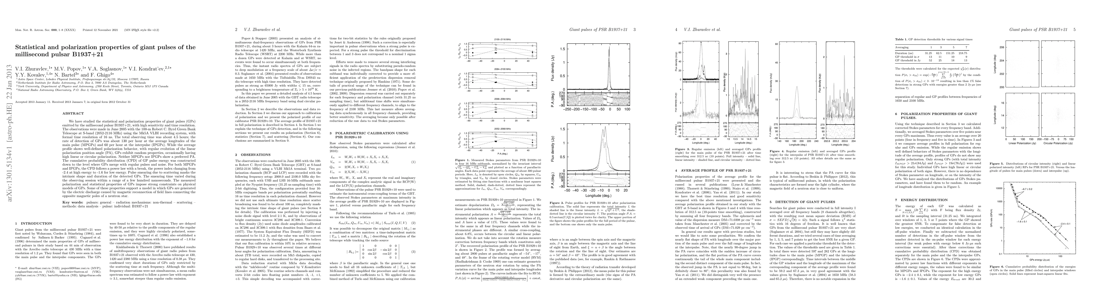 We have studied the statistical and polarization properties of giant pulses (GPs) emitted by the millisecond pulsar B1937+21, with high sensitivity and time resolution. The observations were made in June 2005 with the 100-m Robert C. Byrd Green Bank Telescope at S-band (2052-2116 MHz) using the Mk5A VLBI recording system, with formal time resolution of 16 ns. The total observing time was about 4.5 hours; the rate of detection of GPs was about 130 per hour at the average longitudes of the main pulse (MPGPs) and 60 per hour at the interpulse (IPGPs). While the average profile shows well-defined polarization behavior, with regular evolution of the linear polarization position angle (PA), GPs exhibit random properties, occasionally having high linear or circular polarization. Neither MPGPs nor IPGPs show a preferred PA. The cumulative probability distribution (CPD) of GP pulse energy was constructed down to the level where GPs merge with regular pulses and noise. For both MPGPs and IPGPs, the CPD follows a power law with a break, the power index changing from -2.4 at high energy to -1.6 for low energy. Pulse smearing due to scattering masks the intrinsic shape and duration of the detected GPs. The smearing time varied during the observing session within a range of a few hundred nanoseconds. The measured polarization and statistical properties of GPs impose strong constraints on physical models of GPs. Some of these properties support a model in which GPs are generated by the electric discharge caused by magnetic reconnection of field lines connecting the opposite magnetic poles of a neutron star.