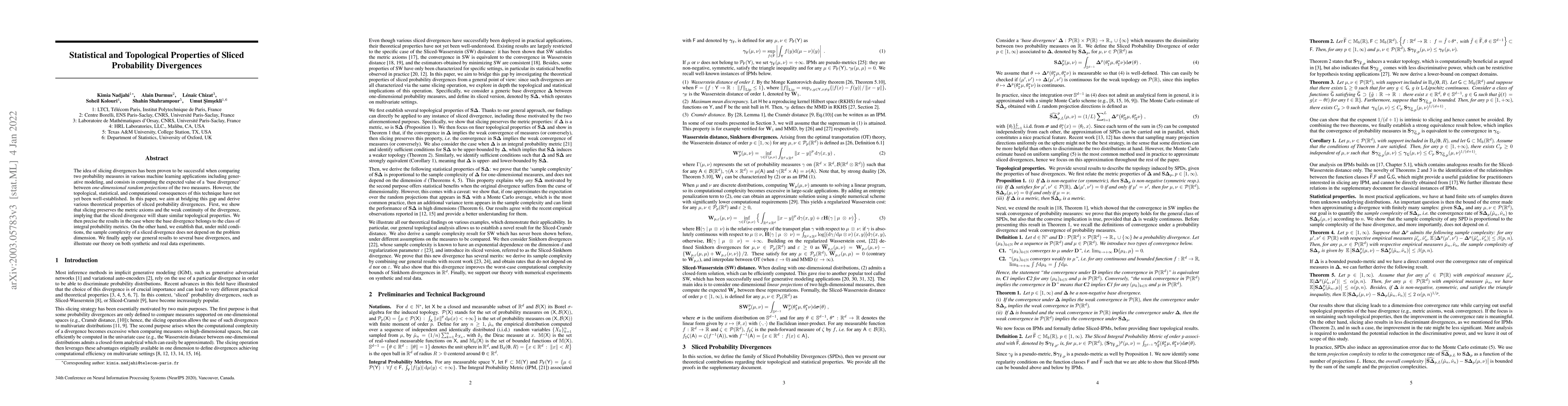 This paper investigates the statistical and topological properties of sliced probability divergences, demonstrating that slicing preserves metric axioms and weak continuity. It also shows that the sample complexity remains independent of problem dimension under mild conditions, providing theoretical insights and empirical validations.