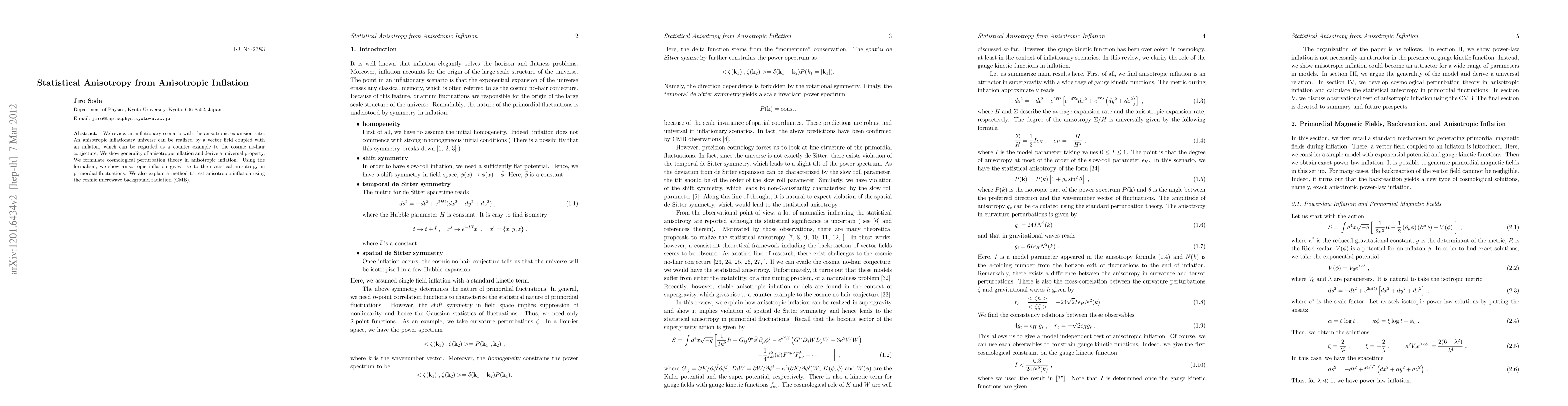 We review an inflationary scenario with the anisotropic expansion rate. An anisotropic inflationary universe can be realized by a vector field coupled with an inflaton, which can be regarded as a counter example to the cosmic no-hair conjecture. We show generality of anisotropic inflation and derive a universal property. We formulate cosmological perturbation theory in anisotropic inflation. Using the formalism, we show anisotropic inflation gives rise to the statistical anisotropy in primordial fluctuations. We also explain a method to test anisotropic inflation using the cosmic microwave background radiation (CMB).