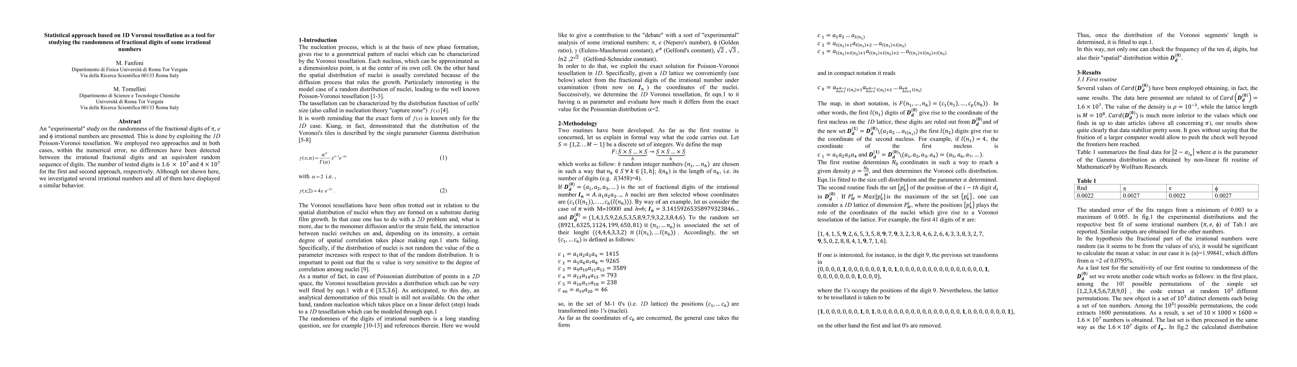 A study found that using 1D Voronoi tessellation, fractional digits of pi, e, and phi were indistinguishable from random sequences within numerical error limits. The research tested over 1.6 million digits and showed similar behavior in multiple irrational numbers.