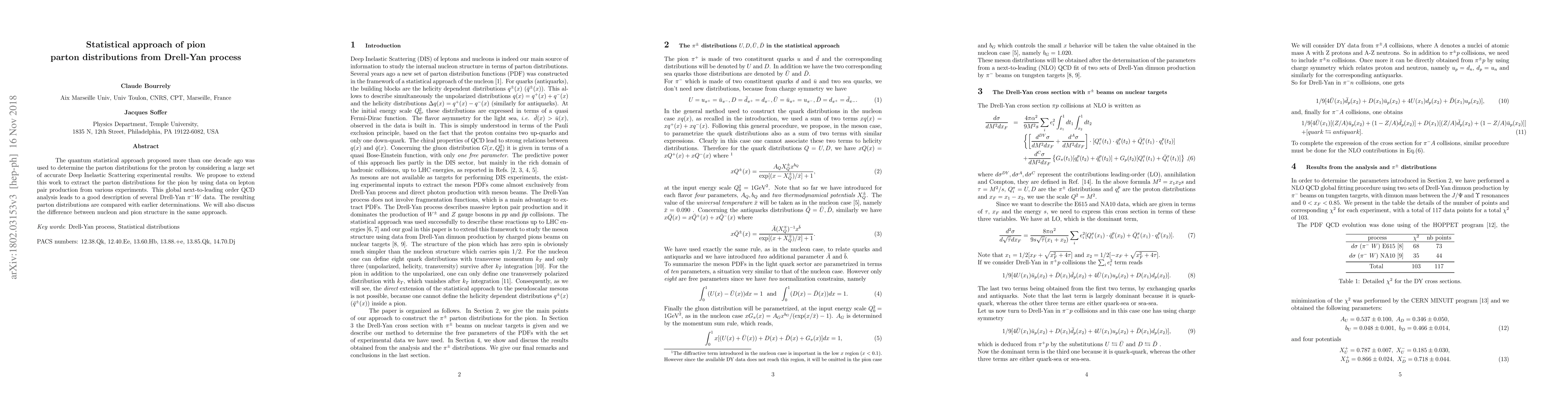 The quantum statistical approach proposed more than one decade ago was used to determine the parton distributions for the proton by considering a large set of accurate Deep Inelastic Scattering experimental results. We propose to extend this work to extract the parton distributions for the pion by using data on lepton pair production from various experiments. This global next-to-leading order QCD analysis leads to a good description of several Drell-Yan $\pi^- W$ data. The resulting parton distributions are compared with earlier determinations. We will also discuss the difference between nucleon and pion structure in the same approach.