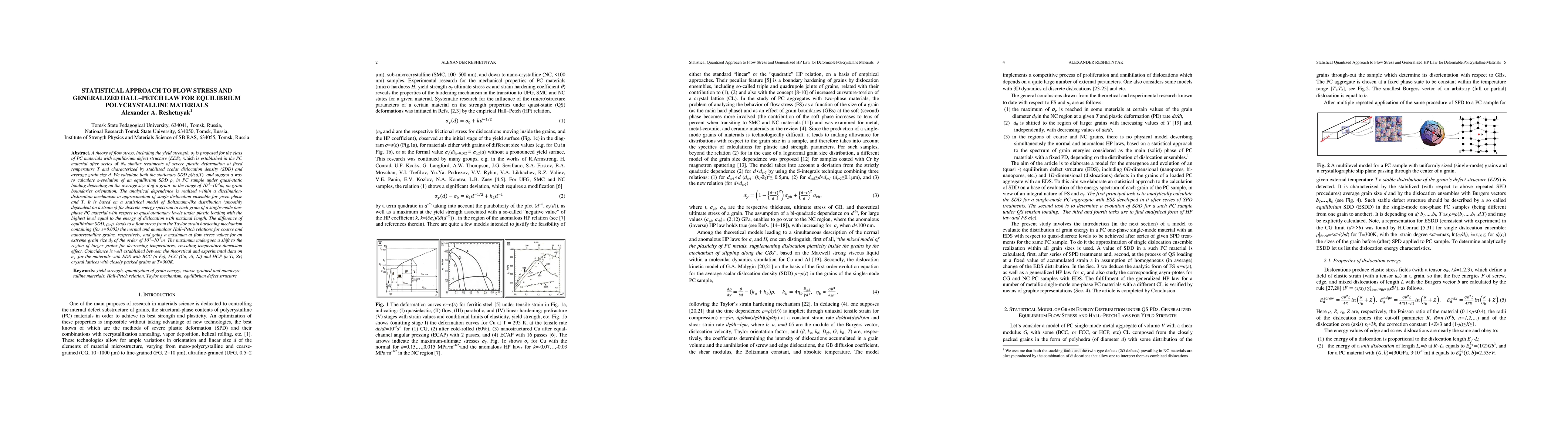 A theory of flow stress, including the yield strength is proposed for the class of PC materials with equilibrium defect structure (EDS), which is established in the PC material after series of $N_0$ similar treatments of severe plastic deformation at fixed temperature T and characterized by stabilized scalar dislocation density (SDD) and average grain size d. We calculate both the stationary SDD $\rho(b,d,T)$ and suggest a way to calculate $\varepsilon$-evolution of an equilibrium SDD $\rho_{\varepsilon}$ in PC sample under quasy-static loading depending on the average size $d$ of a grain in the range of $10^{-8}- 10^{-2}$ m, on grain boundaries orientation. The analytical dependence is realized within a disclination-dislocation mechanism in approximation of single dislocation ensemble for given phase and T. It is based on a statistical model of Boltzmann-like distribution (smoothly dependent on a strain ${\varepsilon}$) for discrete energy spectrum in each grain of a single-mode one-phase PC material with respect to quasi-stationary levels under plastic loading with the highest level equal to the energy of dislocation with maximal length. The difference of equilibrium SDD, $\rho_{\varepsilon}- \rho$, leads to a flow stress from the Taylor strain hardening mechanism containing (for $\varepsilon$ = $0.002$) the normal and anomalous Hall-Petch relations for coarse and nanocrystalline grains, respectively, and gains a maximum at floe stress values for an extreme size containing $d_0$ of order $10^{-8}- 10^{-7}$ m. The maximum undergoes a shift to the region of larger grains for decreasing temperatures, revealing temperature-dimension effect. Coincidence is well established between the theoretical and experimental data on ${\sigma}_y$ for the materials with EDS with BCC (${\alpha}$-Fe), FCC (Cu, Al, Ni) and HCP (${\alpha}$-Ti, Zr) crystal lattices with closely packed grains at T=300K.