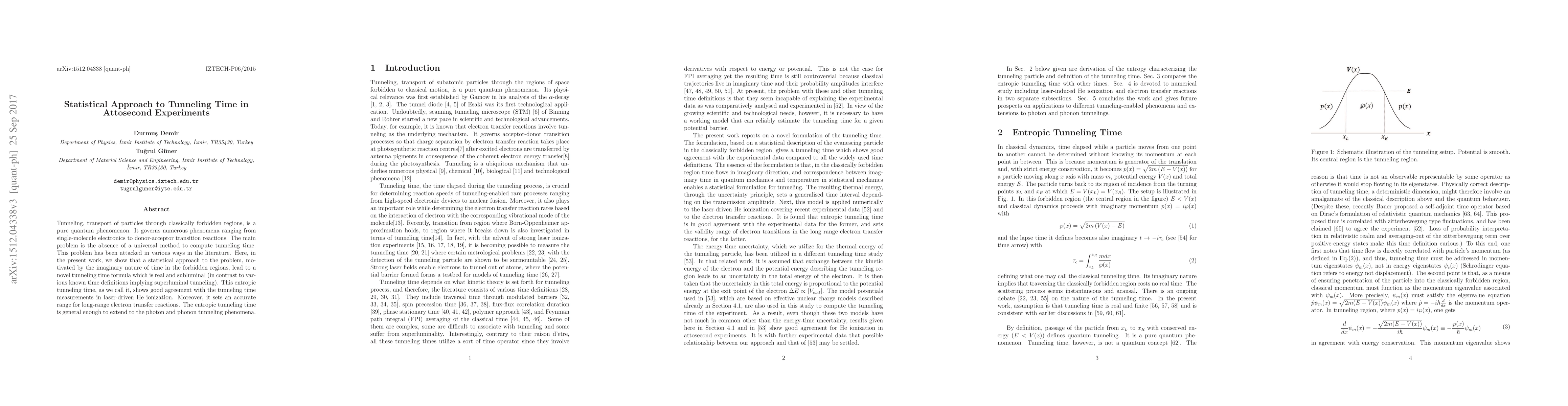 Tunneling, transport of particles through classically forbidden regions, is a pure quantum phenomenon. It governs numerous phenomena ranging from single-molecule electronics to donor-acceptor transition reactions. The main problem is the absence of a universal method to compute tunneling time. This problem has been attacked in various ways in the literature. Here, in the present work, we show that a statistical approach to the problem, motivated by the imaginary nature of time in the forbidden regions, lead to a novel tunneling time formula which is real and subluminal (in contrast to various known time definitions implying superluminal tunneling). This entropic tunneling time, as we call it, shows good agreement with the tunneling time measurements in laser-driven He ionization. Moreover, it sets an accurate range for long-range electron transfer reactions. The entropic tunneling time is general enough to extend to the photon and phonon tunneling phenomena.