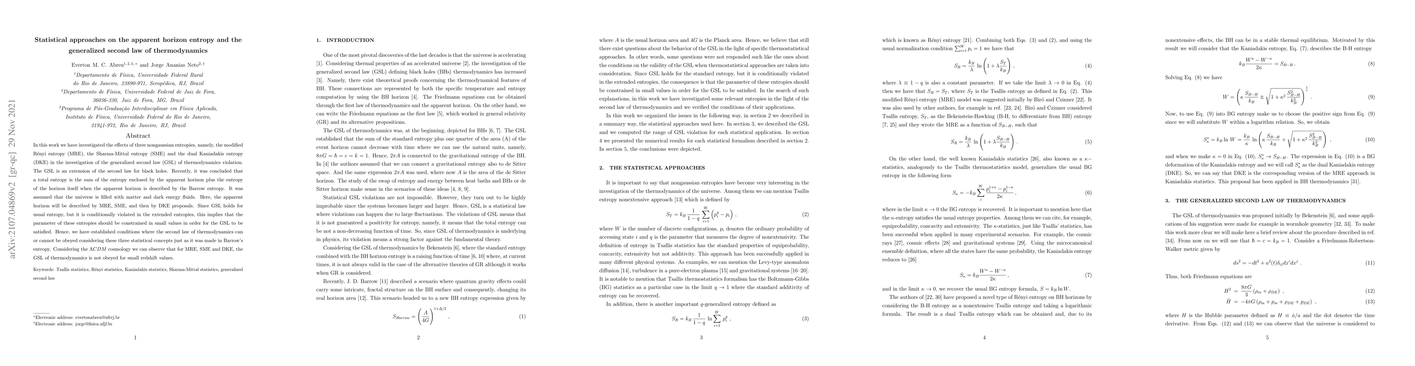 In this work we have investigated the effects of three nongaussian entropies, namely, the modified R\'enyi entropy (MRE), the Sharma-Mittal entropy (SME) and the dual Kaniadakis entropy (DKE) in the investigation of the generalized second law (GSL) of thermodynamics violation. The GSL is an extension of the second law for black holes. Recently, it was concluded that a total entropy is the sum of the entropy enclosed by the apparent horizon plus the entropy of the horizon itself when the apparent horizon is described by the Barrow entropy. It was assumed that the universe is filled with matter and dark energy fluids. Here, the apparent horizon will be described by MRE, SME, and then by DKE proposals. Since GSL holds for usual entropy, but it is conditionally violated in the extended entropies, this implies that the parameter of these entropies should be constrained in small values in order for the GSL to be satisfied. Hence, we have established conditions where the second law of thermodynamics can or cannot be obeyed considering these three statistical concepts just as it was made in Barrow's entropy. Considering the $\Lambda CDM$ cosmology we can observe that for MRE, SME and DKE, the GSL of thermodynamics is not obeyed for small redshift values.