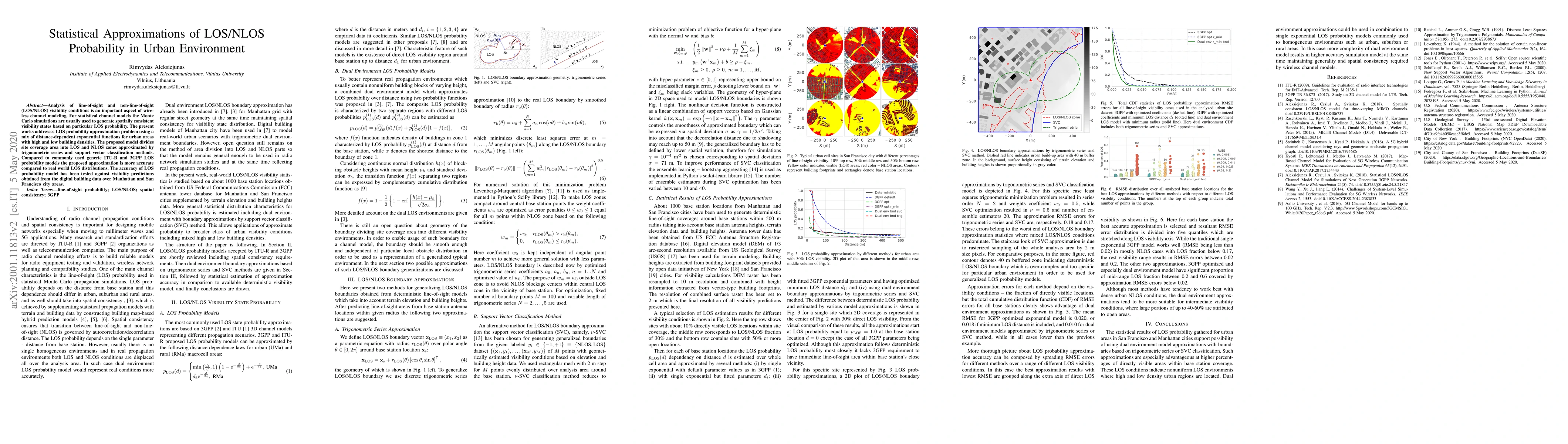 This paper proposes a statistical model for estimating line-of-sight (LOS) probability in urban environments using distance-dependent exponential functions, dividing coverage areas into LOS and non-line-of-sight (NLOS) zones via trigonometric series and support vector classification. The model demonstrates superior accuracy compared to standard ITU-R and 3GPP models, validated against real-world data from Manhattan and San Francisco.