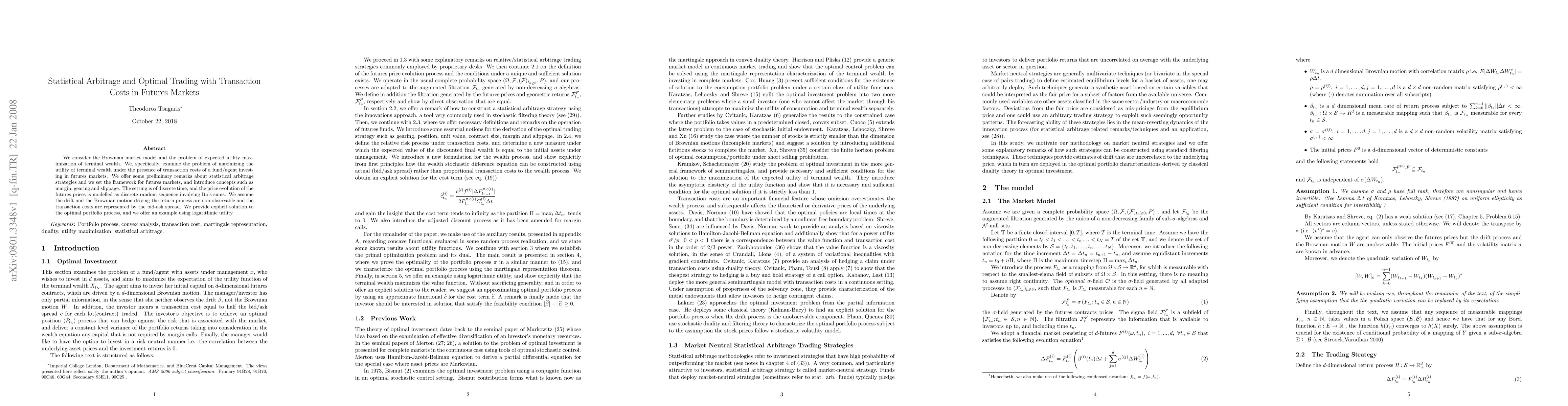 This paper explores how to maximize terminal wealth in futures markets with transaction costs, using a statistical arbitrage approach and providing an explicit solution for optimal portfolio management.
