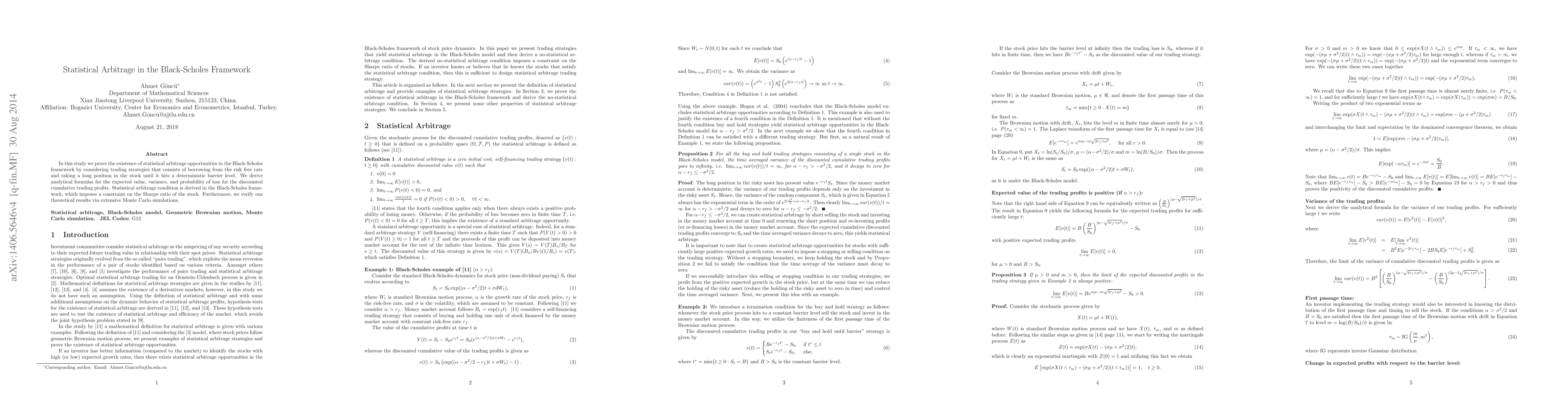 This paper demonstrates the existence of statistical arbitrage opportunities within the Black-Scholes framework through specific trading strategies, deriving analytical formulas for expected value, variance, and probability of loss. It also establishes a no-arbitrage condition linked to the Sharpe ratio and validates findings with Monte Carlo simulations.