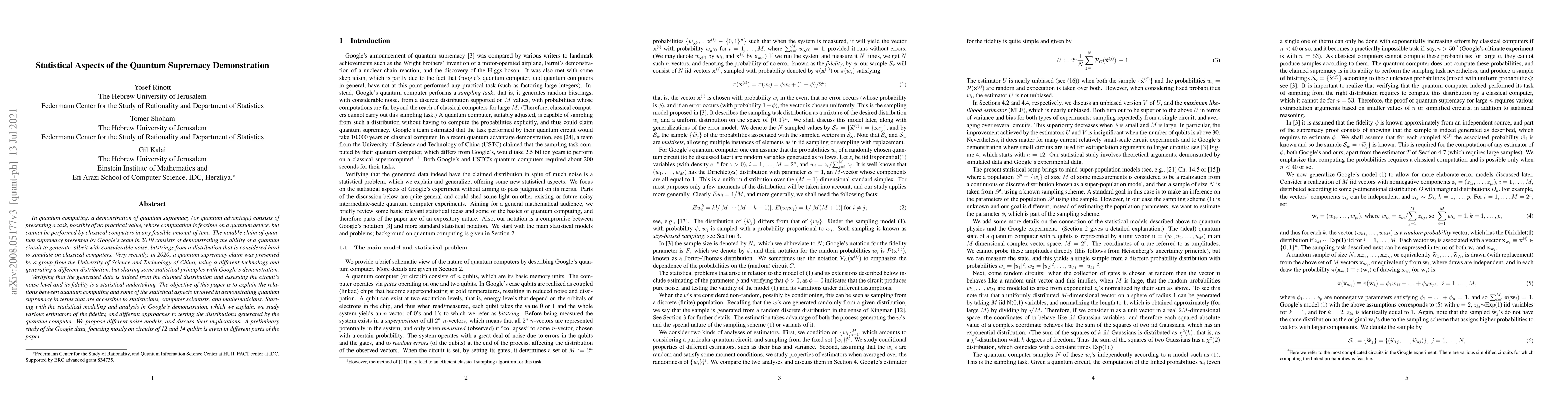 The notable claim of quantum supremacy presented by Google's team in 2019 consists of demonstrating the ability of a quantum circuit to generate, albeit with considerable noise, bitstrings from a distribution that is considered hard to simulate on classical computers. Verifying that the generated data is indeed from the claimed distribution and assessing the circuit's noise level and its fidelity is a purely statistical undertaking. The objective of this paper is to explain the relations between quantum computing and some of the statistical aspects involved in demonstrating quantum supremacy in terms that are accessible to statisticians, computer scientists, and mathematicians. Starting with the statistical analysis in Google's demonstration, which we explain, we study various estimators of the fidelity, and different approaches to testing the distributions generated by the quantum computer. We propose different noise models, and discuss their implications. A preliminary study of the Google data, focusing mostly on circuits of 12 and 14 qubits is discussed throughout the paper.
