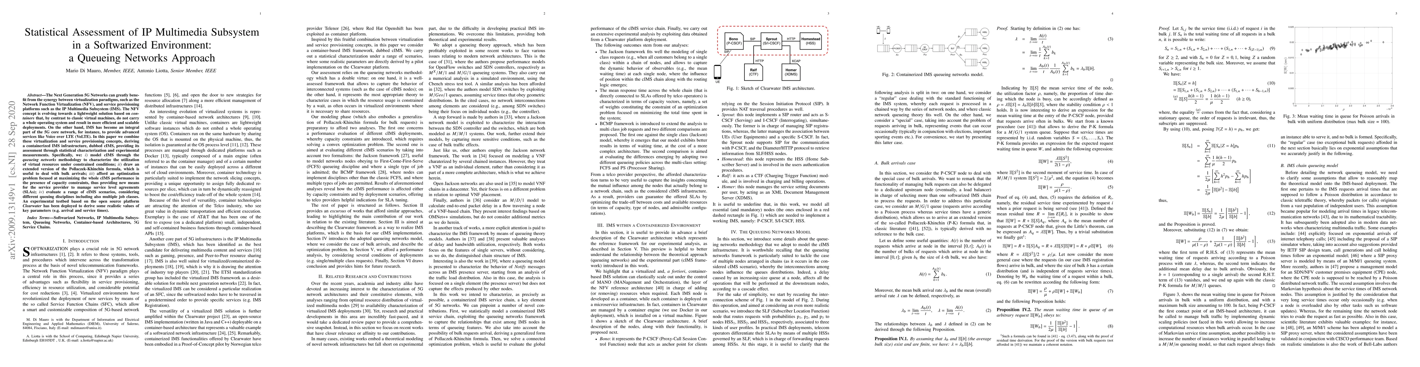 This paper assesses a containerized IP Multimedia Subsystem (cIMS) in a softwarized environment using queueing networks approach, focusing on statistical characterization and optimization of virtual resources under capacity constraints.