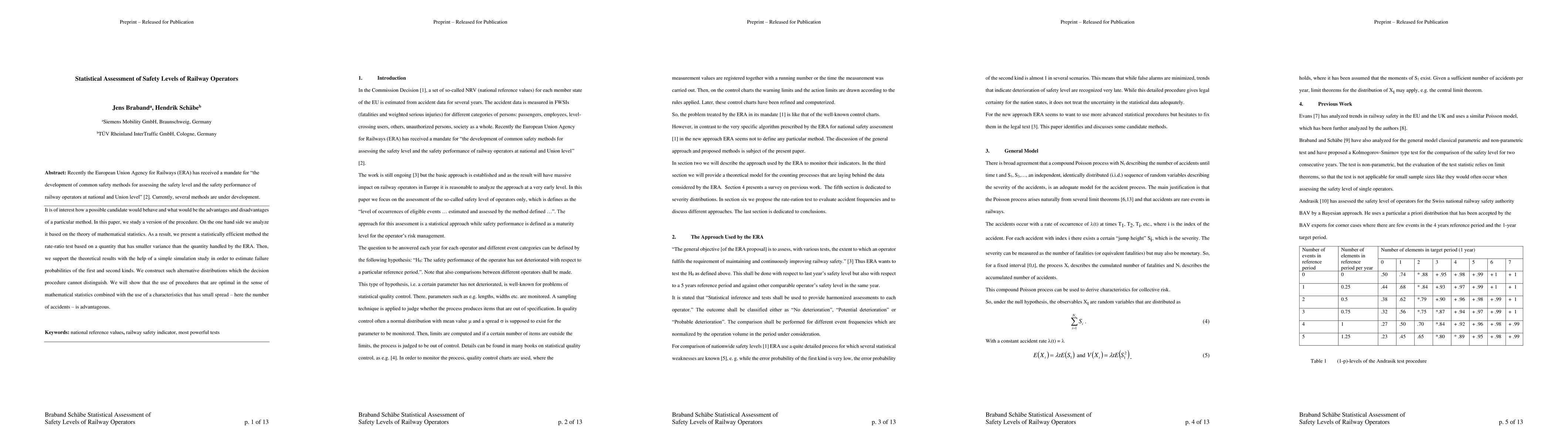 Recently the European Union Agency for Railways (ERA) has received a mandate for 'the development of common safety methods for assessing the safety level and the safety performance of railway operators at national and Union level'. Currently, several methods are under development. It is of interest how a possible candidate would behave and what would be the advantages and disadvantages of a particular method. In this paper, we study a version of the procedure. On the one hand side we analyze it based on the theory of mathematical statistics. As a result, we present a statistically efficient method the rate-ratio test based on a quantity that has smaller variance than the quantity handled by the ERA. Then, we support the theoretical results with the help of a simple simulation study in order to estimate failure probabilities of the first and second kinds. We construct such alternative distributions which the decision procedure cannot distinguish. We will show that the use of procedures that are optimal in the sense of mathematical statistics combined with the use of a characteristics that has small spread, here the number of accidents, is advantageous.