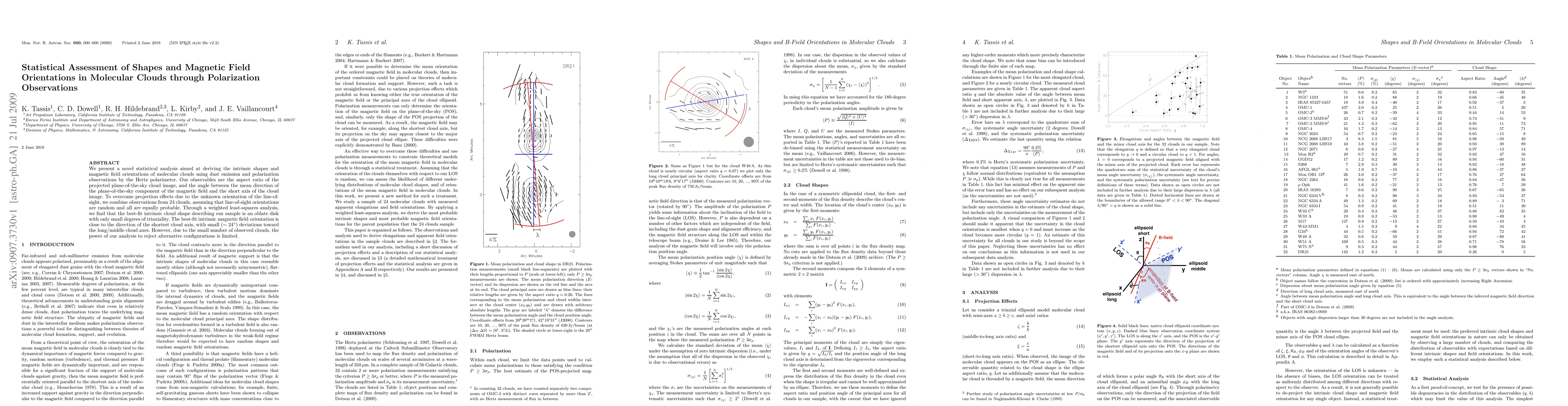 This paper statistically analyzes molecular cloud shapes and magnetic field orientations using polarization observations, finding oblate disk shapes and magnetic fields oriented close to the shortest cloud axis. The study combines observations from 24 clouds to mitigate projection effects, but acknowledges limitations due to the small sample size.