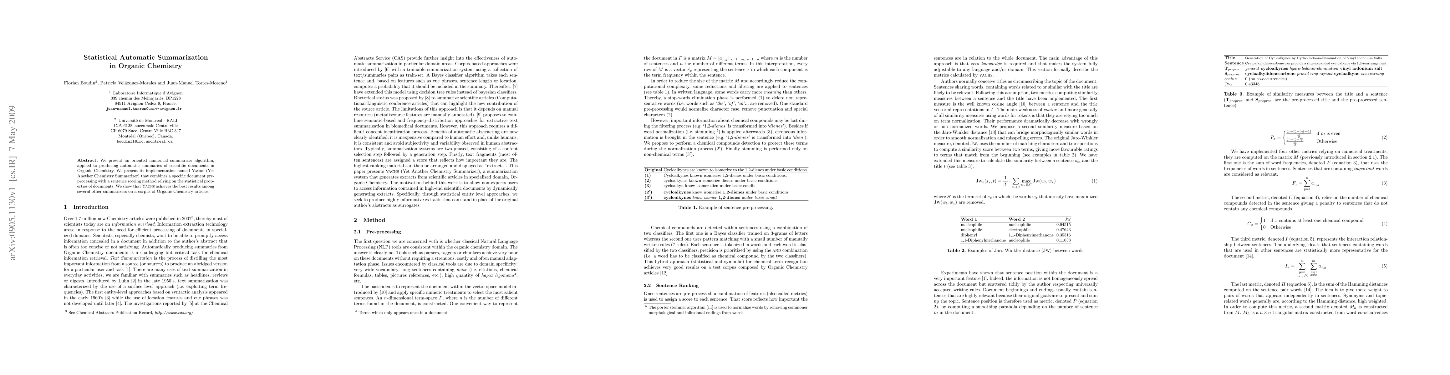 This paper introduces Yachs, a statistical automatic summarizer algorithm for Organic Chemistry documents, combining document pre-processing and sentence scoring based on statistical properties. Yachs outperforms other summarizers on a corpus of Organic Chemistry articles.