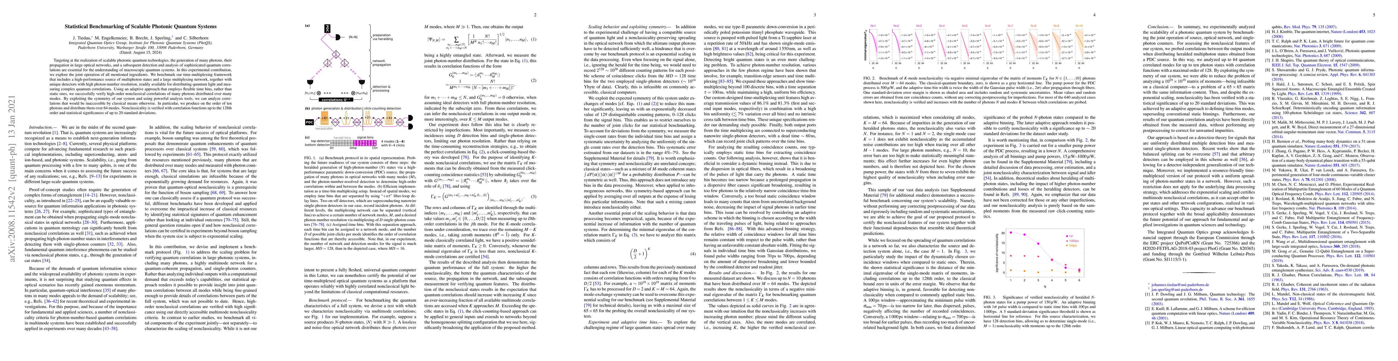 Targeting at the realization of scalable photonic quantum technologies, the generation of many photons, their propagation in large optical networks, and a subsequent detection and analysis of sophisticated quantum correlations are essential for the understanding of macroscopic quantum systems. In this experimental contribution, we explore the joint operation of all mentioned ingredients. We benchmark our time-multiplexing framework that includes a high-performance source of multiphoton states and a large multiplexing network, together with unique detectors with high photon-number resolution, readily available for distributing quantum light and measuring complex quantum correlations. Using an adaptive approach that employs flexible time bins, rather than static ones, we successfully verify high-order nonclassical correlations of many photons distributed over many modes. By exploiting the symmetry of our system and using powerful analysis tools, we can analyze correlations that would be inaccessible by classical means otherwise. In particular, we produce on the order of ten photons and distribute them over 64 modes. Nonclassicality is verified with correlation functions up to the 128th order and statistical significances of up to 20 standard deviations.