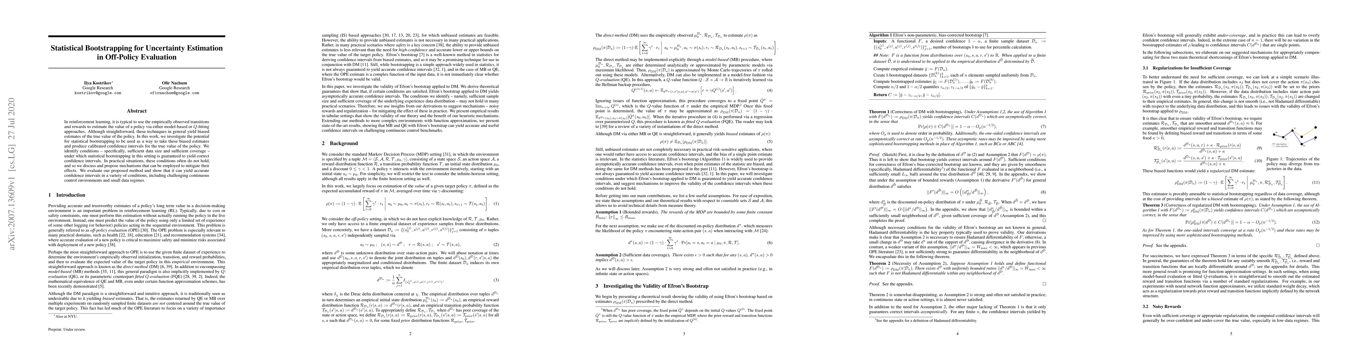 This paper explores using statistical bootstrapping to estimate uncertainty in off-policy evaluation for reinforcement learning, proposing conditions for correct confidence intervals and mechanisms to mitigate biases when these conditions are not met. The method is shown to yield accurate confidence intervals in various environments.