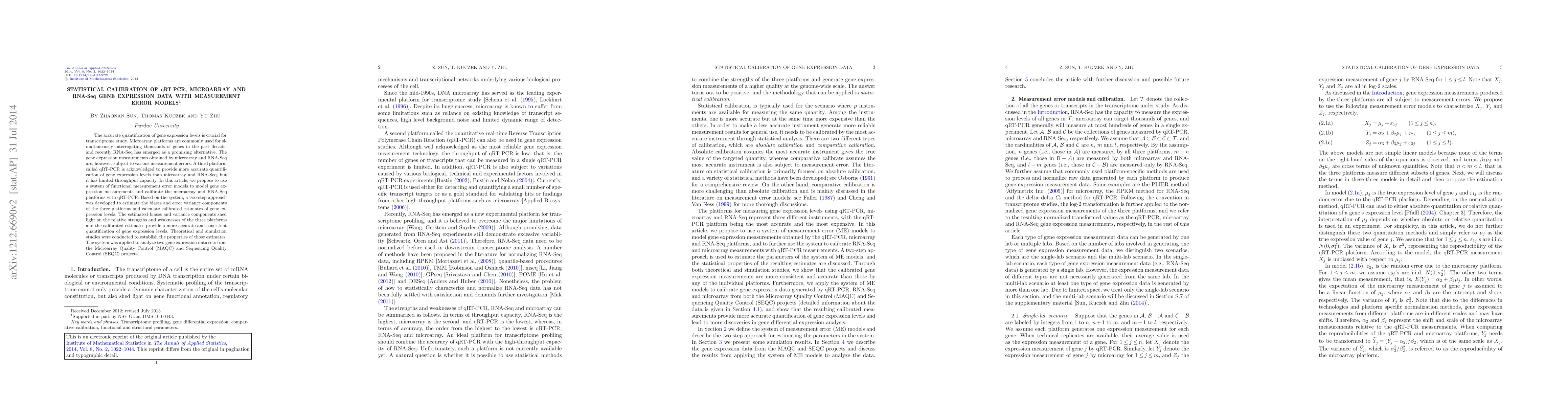 This paper proposes a system of functional measurement error models to calibrate gene expression data from microarray and RNA-Seq platforms using qRT-PCR, which provides more accurate quantification. The developed two-step approach estimates biases and error variances, leading to more accurate and consistent gene expression estimates, as demonstrated through theoretical studies and analysis of MAQC and SEQC datasets.