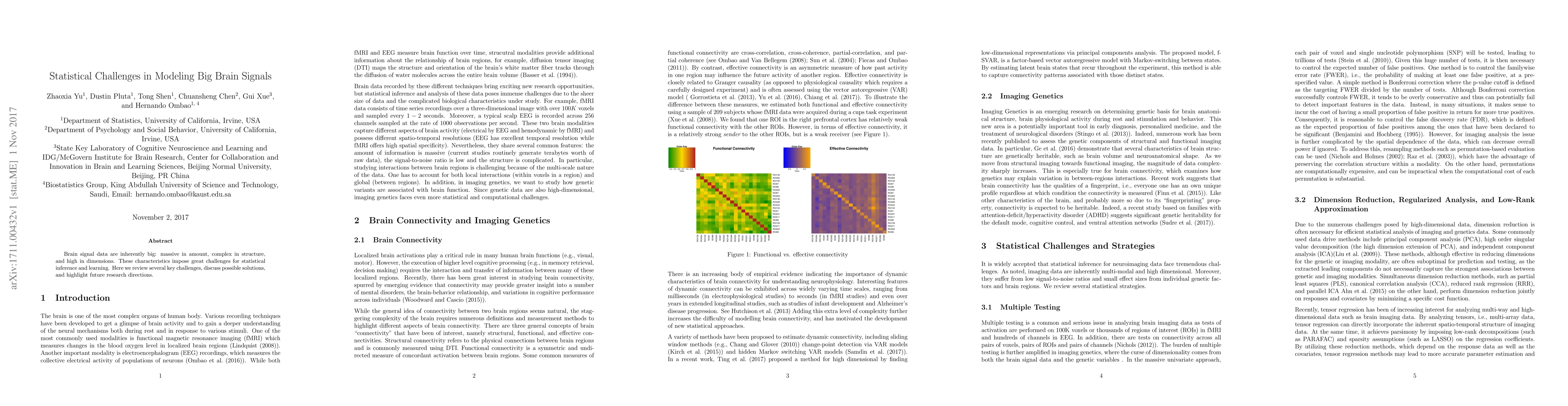 Brain signal data are inherently big: massive in amount, complex in structure, and high in dimensions. These characteristics impose great challenges for statistical inference and learning. Here we review several key challenges, discuss possible solutions, and highlight future research directions.