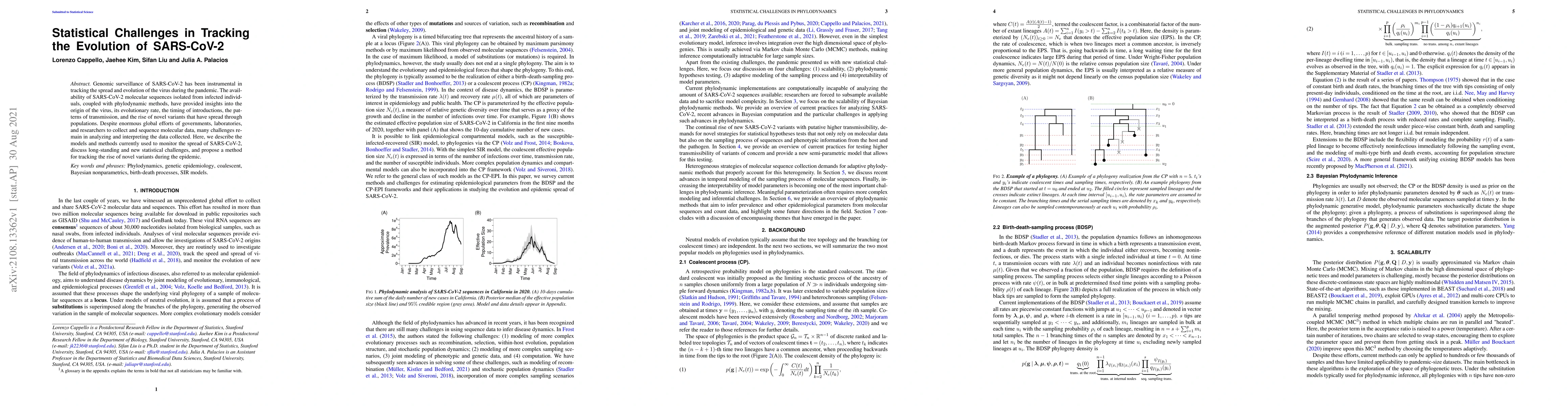 The paper outlines statistical challenges in tracking the evolution of SARS-CoV-2 using genomic surveillance and phylodynamic methods, discussing models, methods, and proposed solutions for monitoring the spread and identifying novel variants.