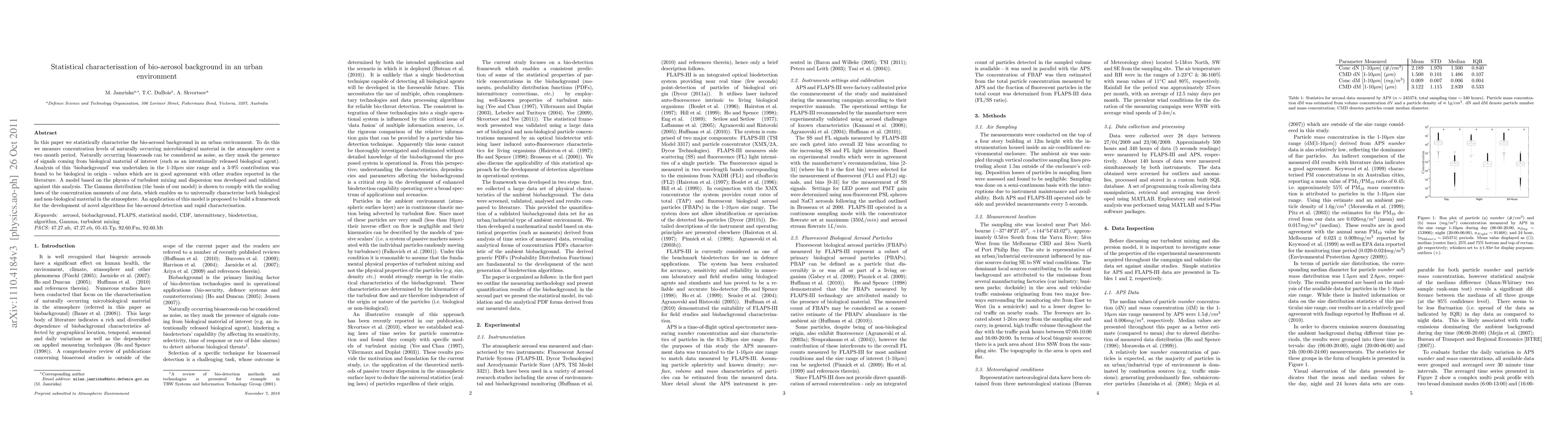 In this paper we statistically characterise the bio-aerosol background in an urban environment. To do this we measure concentration levels of naturally occurring microbiological material in the atmosphere over a two month period. Naturally occurring bioaerosols can be considered as noise, as they mask the presence of signals coming from biological material of interest (such as an intentionally released biological agent). Analysis of this 'biobackground' was undertaken in the 1-10 um size range and a 3-9% contribution was found to be biological in origin - values which are in good agreement with other studies reported in the literature. A model based on the physics of turbulent mixing and dispersion was developed and validated against this analysis. The Gamma distribution (the basis of our model) is shown to comply with the scaling laws of the concentration moments of our data, which enables us to universally characterise both biological and non-biological material in the atmosphere. An application of this model is proposed to build a framework for the development of novel algorithms for bio-aerosol detection and rapid characterisation.