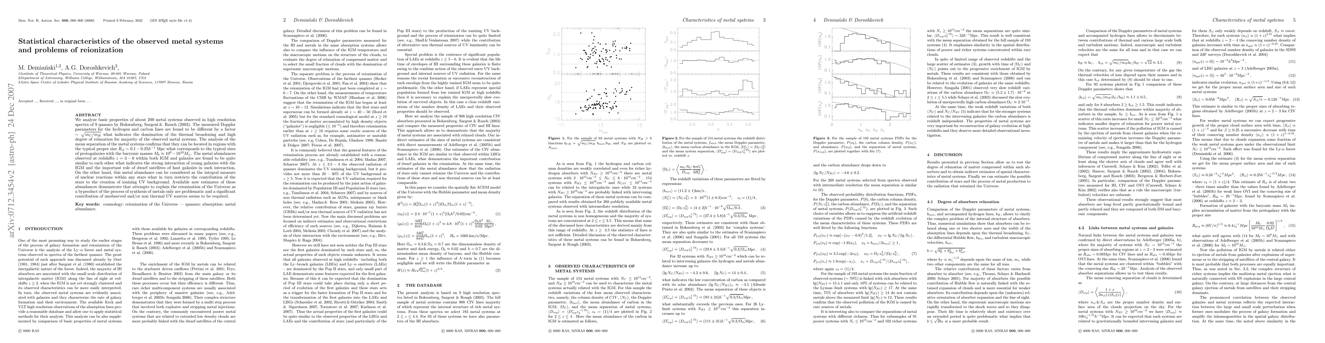 We analyze basic properties of about 200 metal systems observed in high resolution spectra of 9 quasars by Boksenberg, Sargent & Rauch (2003). The measured Doppler parameters for the hydrogen and carbon lines are found to be different by a factor $\sim\sqrt{m_C/ m_H}$ what indicates the domination of the thermal broadening and high degree of relaxation for majority of the observed metal systems. The analysis of the mean separation of the metal systems confirms that they can be located in regions with the typical proper size $R_{cl}\sim 0.1 - 0.25h^{-1}$ Mpc what corresponds to the typical sizes of protogalaxies with the baryonic masses $M_b\approx 10^9-10^{10}M_\odot$. The metal abundances observed at redshifts $z=3 - 6$ within both IGM and galaxies are found to be quite similar to each other what indicates the strong interaction of young galaxies with the IGM and the important role of dwarf satellites of host galaxies in such interaction. On the other hand, this metal abundance can be considered as the integral measure of nuclear reactions within any stars what in turn restricts the contribution of the stars to the creation of ionizing UV background. Available now estimates of these abundances demonstrate that attempts to explain the reionization of the Universe as a byproduct of the process of synthesis of metals only are problematic and a significant contribution of unobserved and/or non thermal UV sources seems to be required.