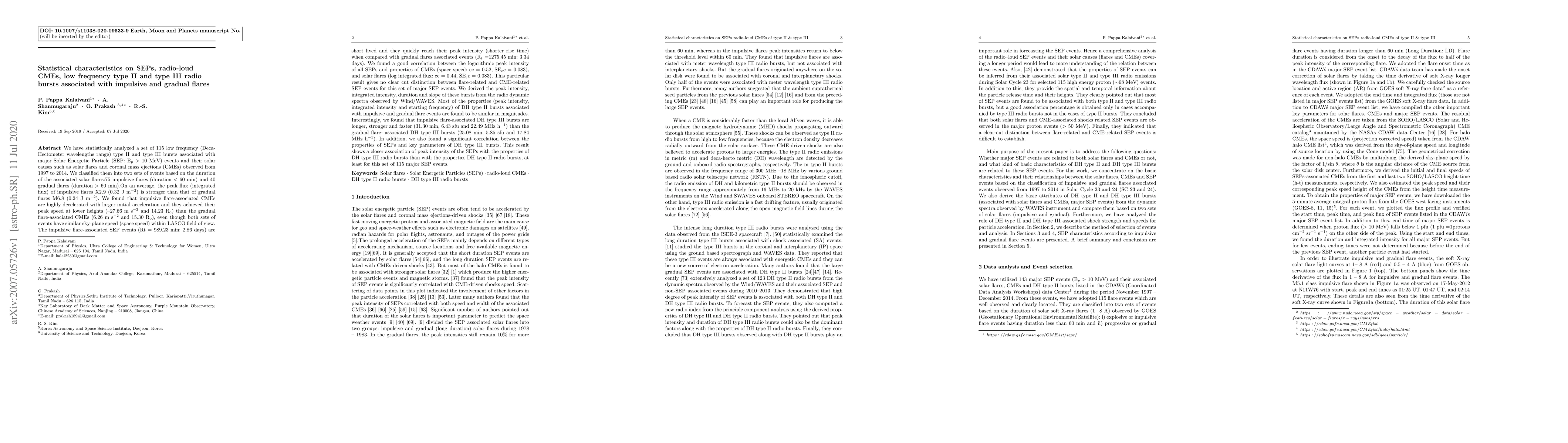 This study statistically analyzes 115 low frequency type II and III radio bursts linked to major SEP events from 1997 to 2014, categorizing them into impulsive and gradual flares. It finds that impulsive flares have shorter rise times and no clear distinction between flare-related and CME-related SEP events, while type III bursts show a closer association with SEP peak intensity.