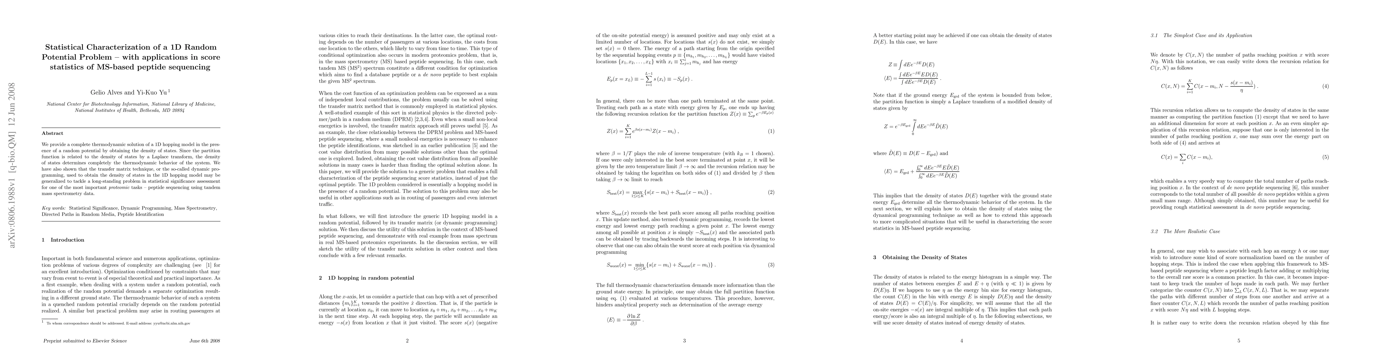 We provide a complete thermodynamic solution of a 1D hopping model in the presence of a random potential by obtaining the density of states. Since the partition function is related to the density of states by a Laplace transform, the density of states determines completely the thermodynamic behavior of the system. We have also shown that the transfer matrix technique, or the so-called dynamic programming, used to obtain the density of states in the 1D hopping model may be generalized to tackle a long-standing problem in statistical significance assessment for one of the most important proteomic tasks - peptide sequencing using tandem mass spectrometry data.