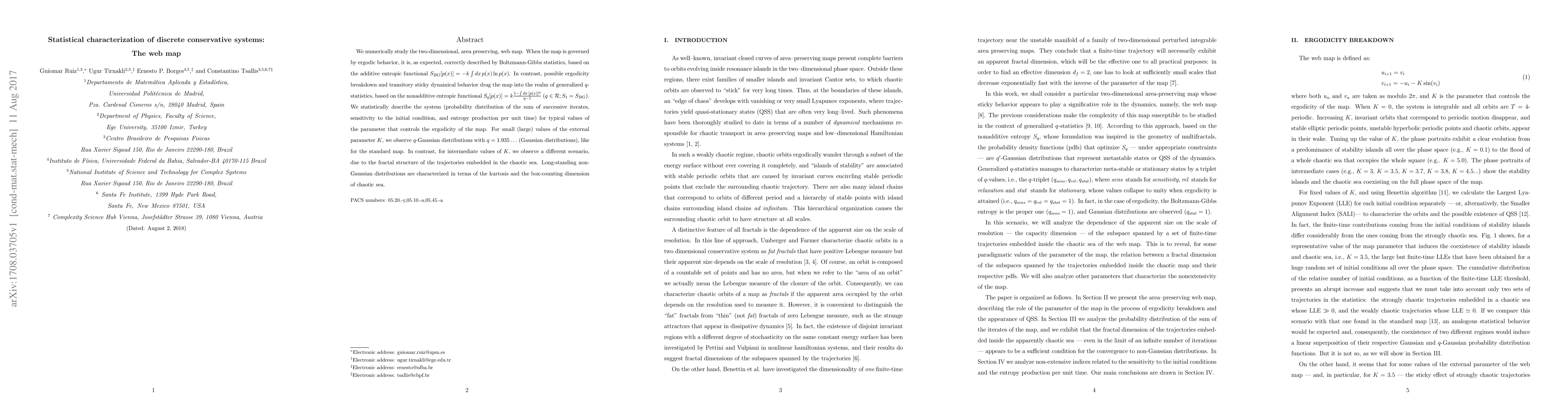 We numerically study the two-dimensional, area preserving, web map. When the map is governed by ergodic behavior, it is, as expected, correctly described by Boltzmann-Gibbs statistics, based on the additive entropic functional $S_{BG}[p(x)] = -k\int dx\,p(x) \ln p(x)$. In contrast, possible ergodicity breakdown and transitory sticky dynamical behavior drag the map into the realm of generalized $q$-statistics, based on the nonadditive entropic functional $S_q[p(x)]=k\frac{1-\int dx\,[p(x)]^q}{q-1}$ ($q \in {\cal R}; S_1=S_{BG}$). We statistically describe the system (probability distribution of the sum of successive iterates, sensitivity to the initial condition, and entropy production per unit time) for typical values of the parameter that controls the ergodicity of the map. For small (large) values of the external parameter $K$, we observe $q$-Gaussian distributions with $q=1.935\dots$ (Gaussian distributions), like for the standard map. In contrast, for intermediate values of $K$, we observe a different scenario, due to the fractal structure of the trajectories embedded in the chaotic sea. Long-standing non-Gaussian distributions are characterized in terms of the kurtosis and the box-counting dimension of chaotic sea.