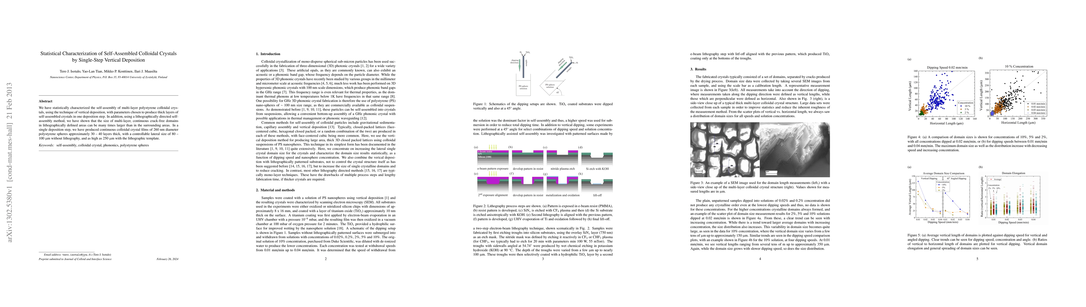 This paper statistically characterizes the self-assembly of multi-layer polystyrene colloidal crystals via single-step vertical deposition, achieving thick layers in one deposition. It also demonstrates that lithographically directed self-assembly can significantly increase the size of continuous, crack-free domains in defined areas.