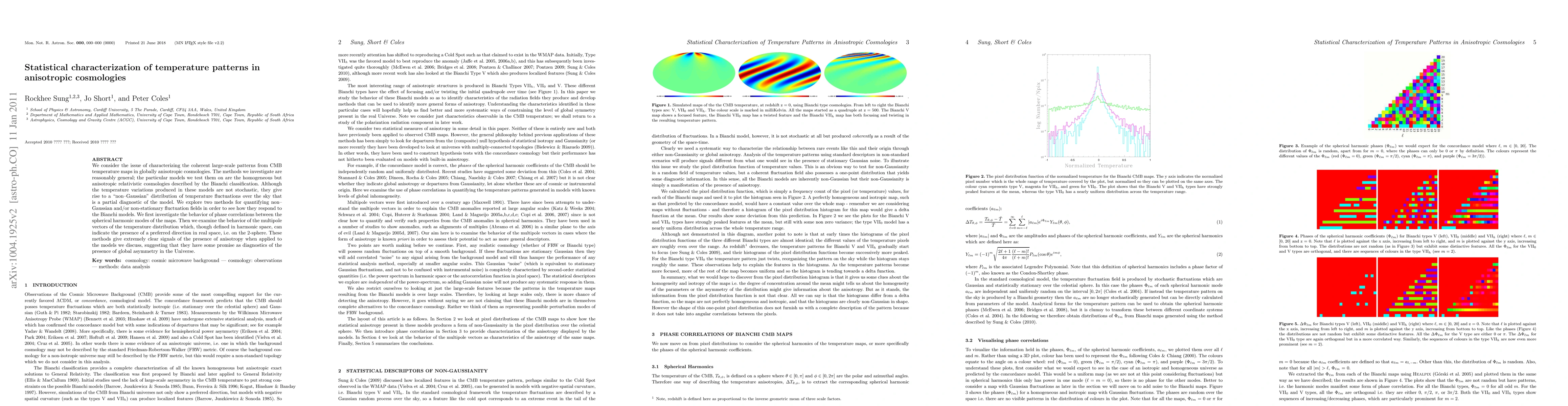 We consider the issue of characterizing the coherent large-scale patterns from CMB temperature maps in globally anisotropic cosmologies. The methods we investigate are reasonably general; the particular models we test them on are the homogeneous but anisotropic relativistic cosmologies described by the Bianchi classification. Although the temperature variations produced in these models are not stochastic, they give rise to a "non-Gaussian" distribution of temperature fluctuations over the sky that is a partial diagnostic of the model. We explore two methods for quantifying non-Gaussian and/or non-stationary fluctuation fields in order to see how they respond to the Bianchi models.We first investigate the behavior of phase correlations between the spherical harmonic modes of the maps. Then we examine the behavior of the multipole vectors of the temperature distribution which, though defined in harmonic space, can indicate the presence of a preferred direction in real space, i.e. on the 2-sphere. These methods give extremely clear signals of the presence of anisotropy when applied to the models we discuss, suggesting that they have some promise as diagnostics of the presence of global asymmetry in the Universe.